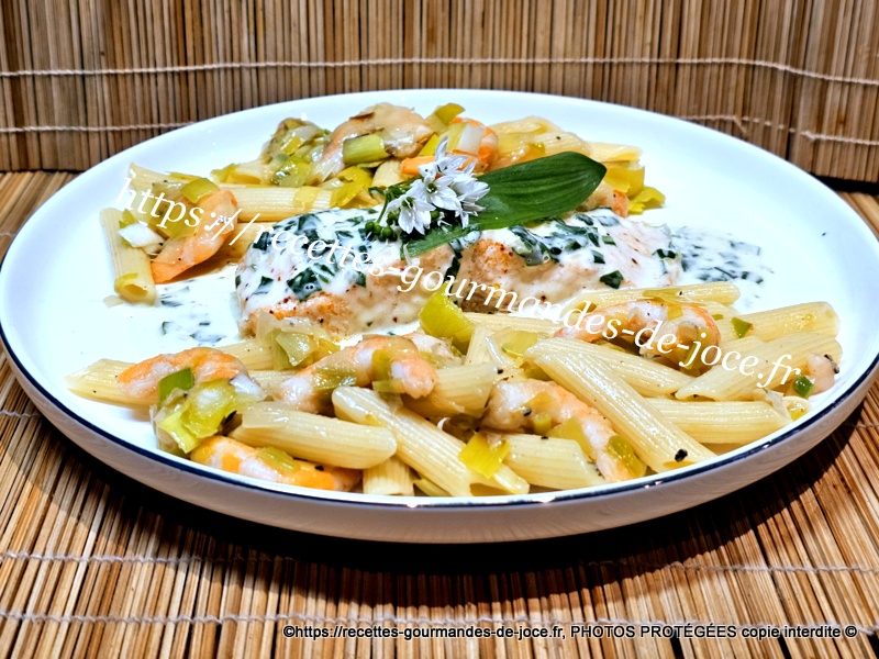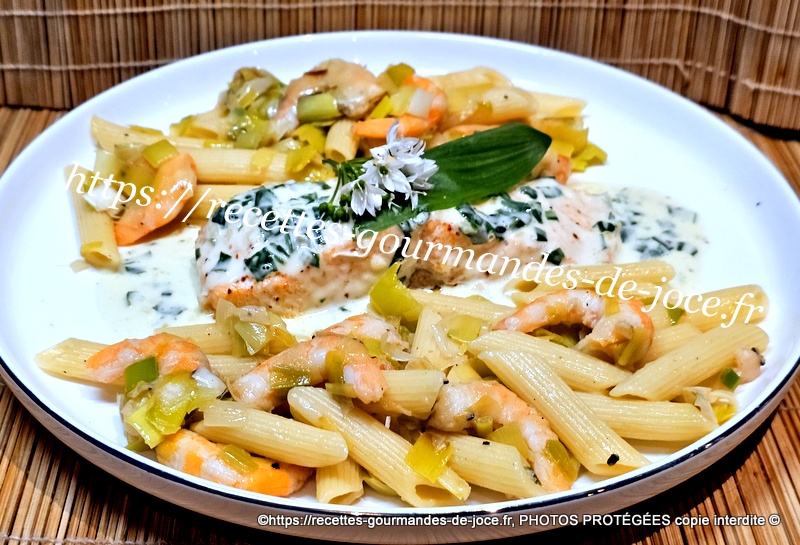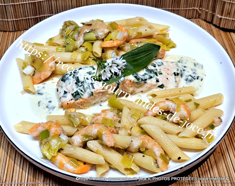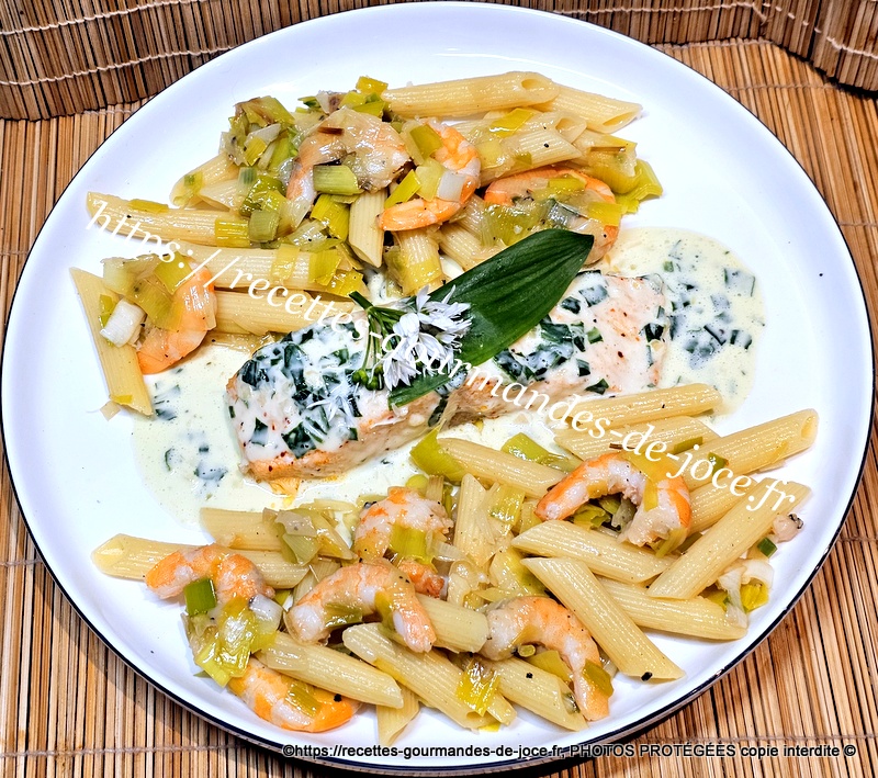 Pavés de saumon à l’ail des ours, pennes aux poireaux et crevettes.