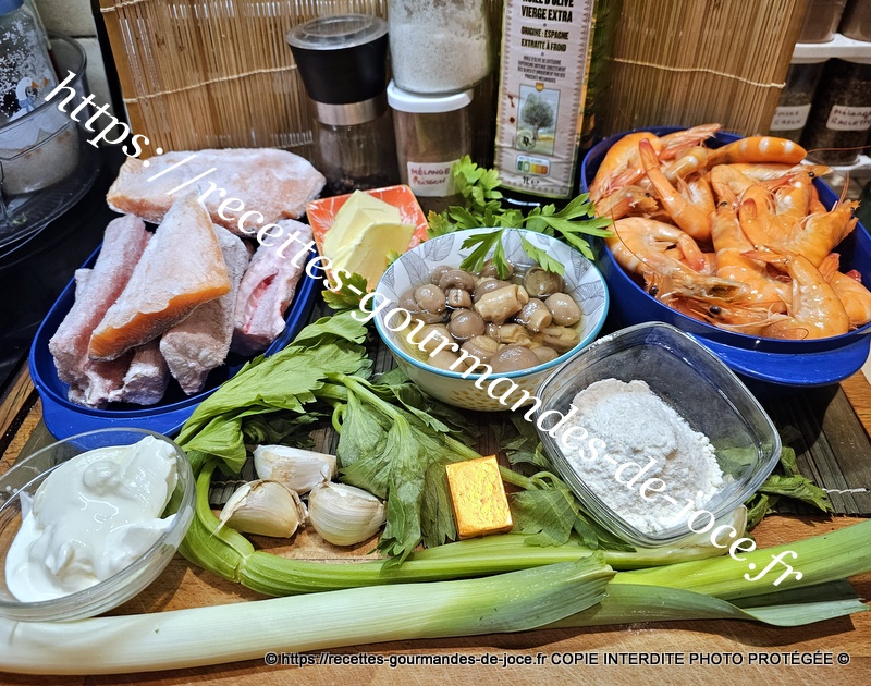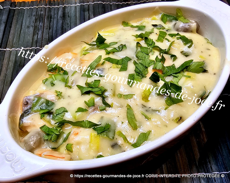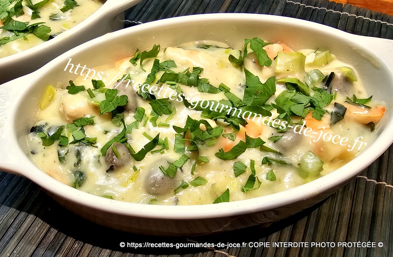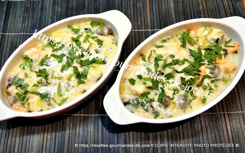 Cassolettes de roussette et saumon aux crevettes, poireaux, céleri et champignons.
