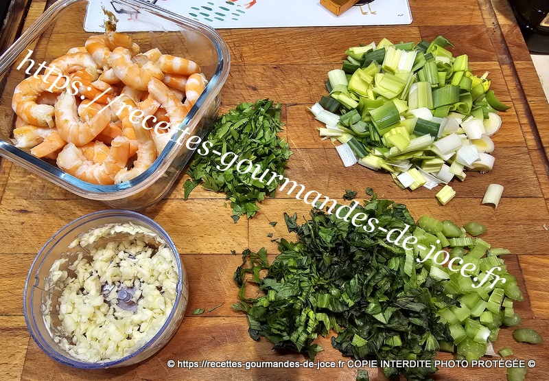 Décortiquer les crevettes, peler et hacher les gousses d’ail dégermées, laver et émincer le poireau, la branche de céleri et le persil. Lorsque la roussette est cuite, l’égoutter. Dans une poêle mettre un filet d’huile d’olive.