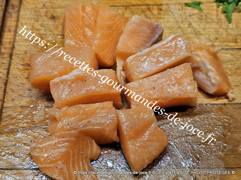 Couvrir d’eau bien chaude et les mettre à pocher à petits frémissements environ 10 à 15 minutes selon la grosseur. Pendant ce temps ôter la peau du saumon et le couper en petits cubes.