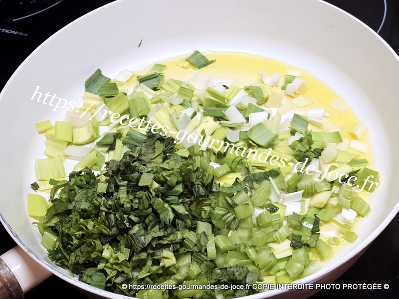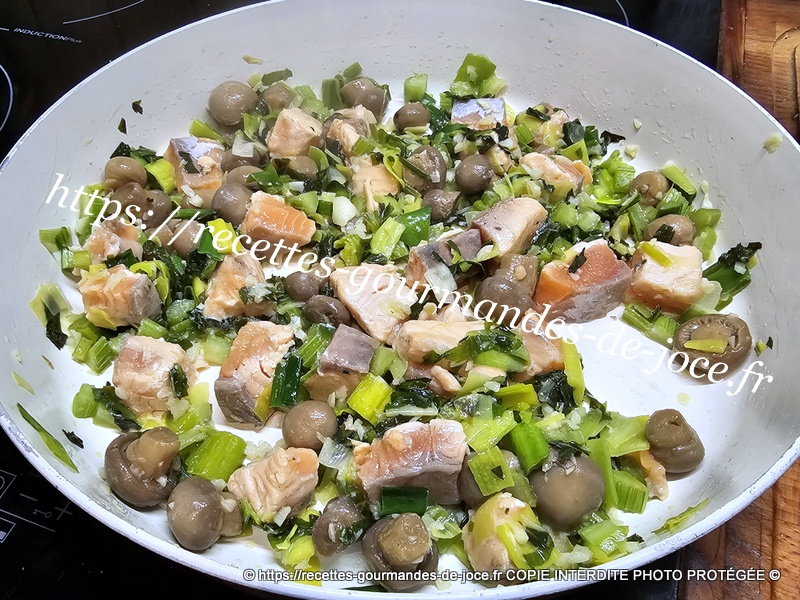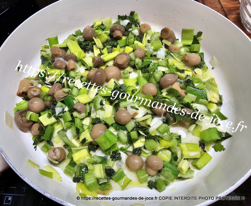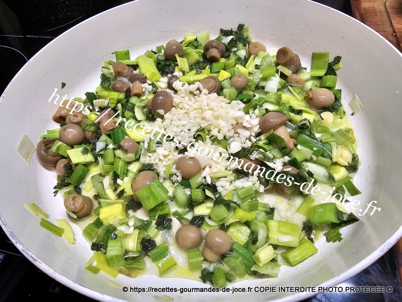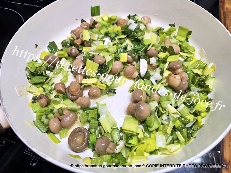 Ajouter les poireaux et le céleri, saler et poivrer. Ajouter les champignons et leur jus, l’ail et mélanger.