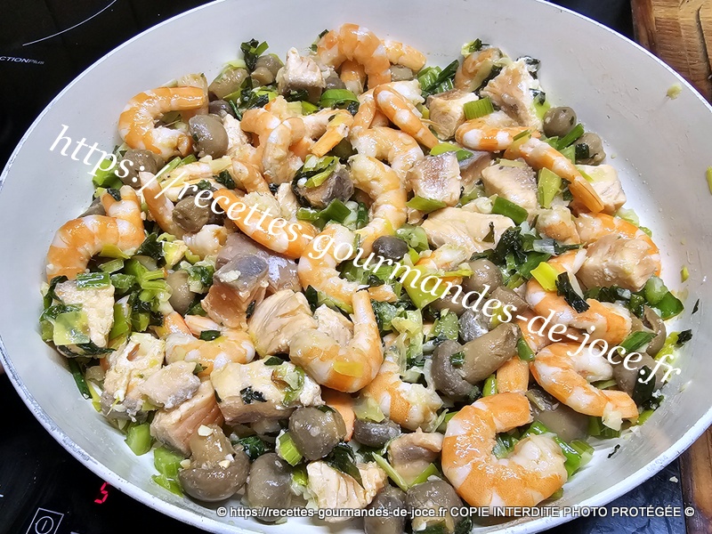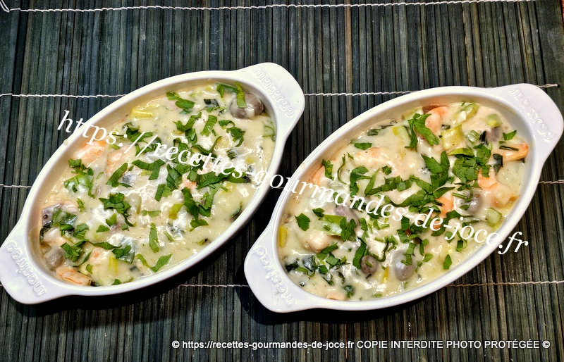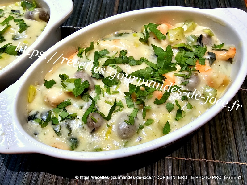 Cassolettes de roussette et saumon aux crevettes, poireaux, céleri et champignons.