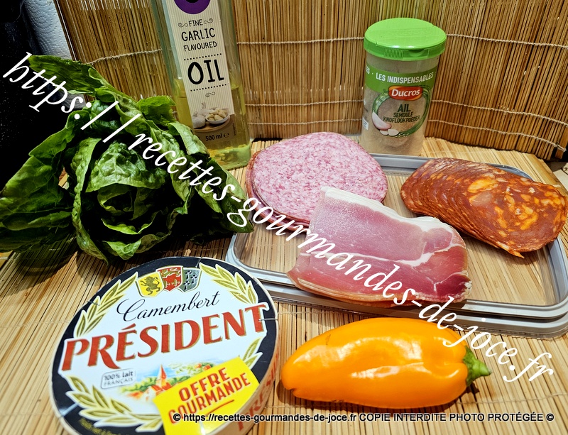 Laver et essorer la salade, l’assaisonner selon vos goûts. Répartir la salade sur un plat, ajouter la charcuterie, le fromage fondu au centre.