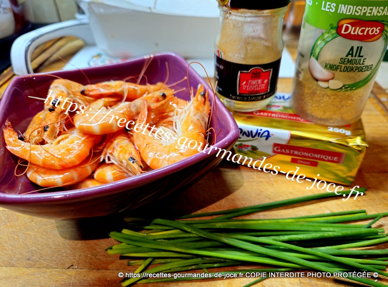 Dans le bol du mixeur, mettre les crevettes et le beurre coupé en morceaux, ajouter la ciboulette et l’ail.