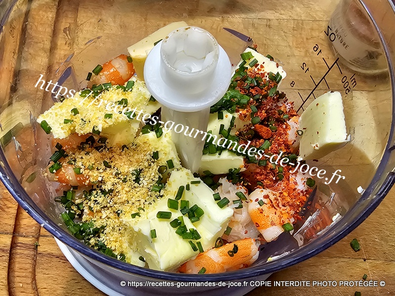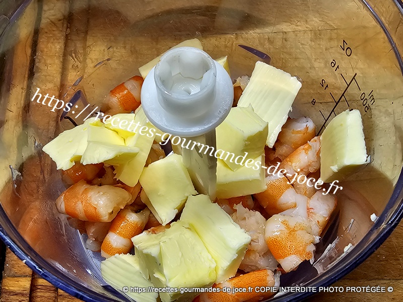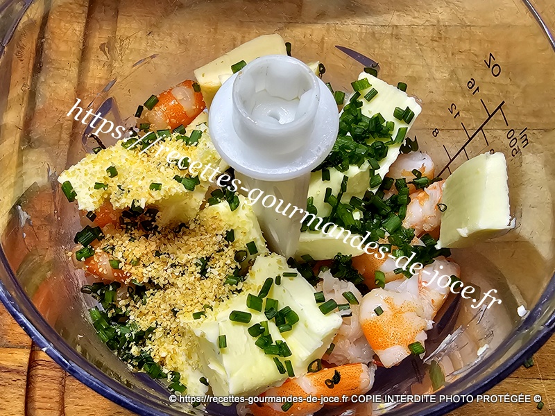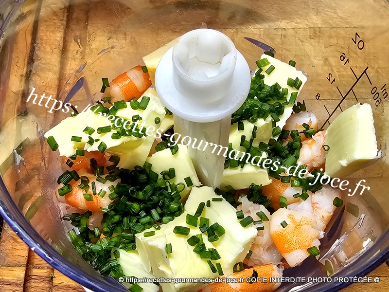 Dans le bol du mixeur, mettre les crevettes et le beurre coupé en morceaux, ajouter la ciboulette et l’ail.