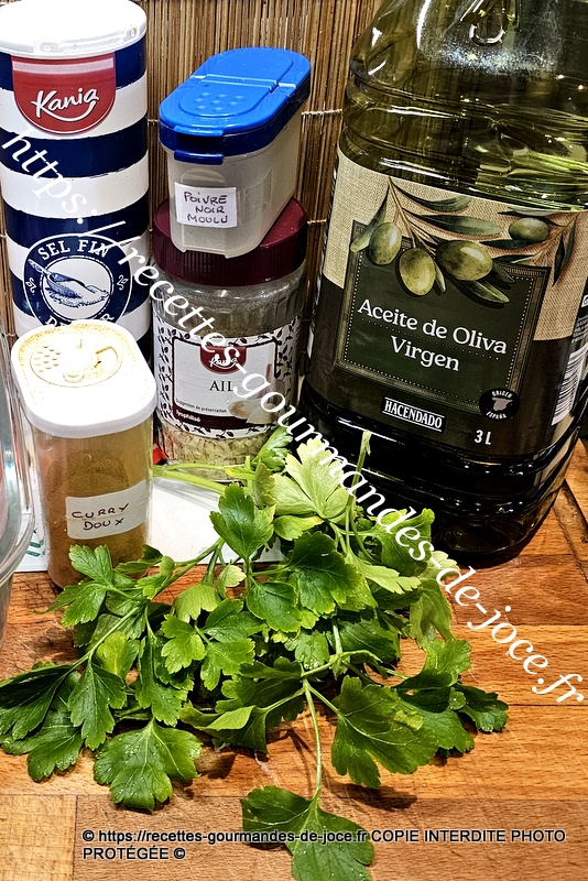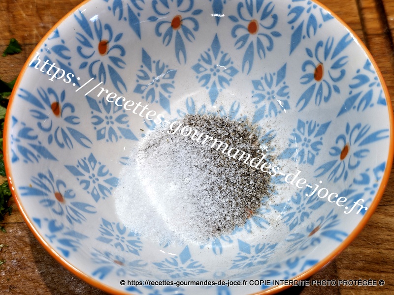 Laver et ciseler finement le persil. Dans un bol, mettre le sel et le poivre, ajouter le curry.