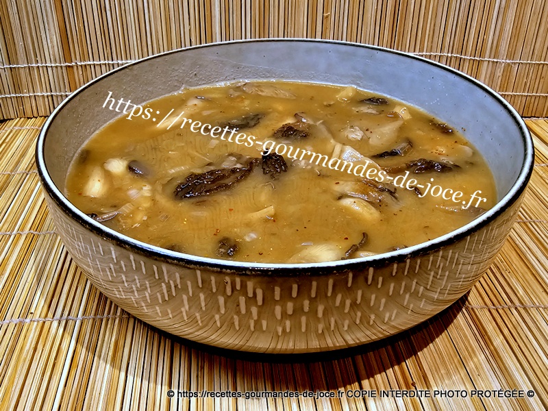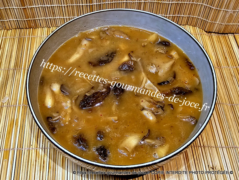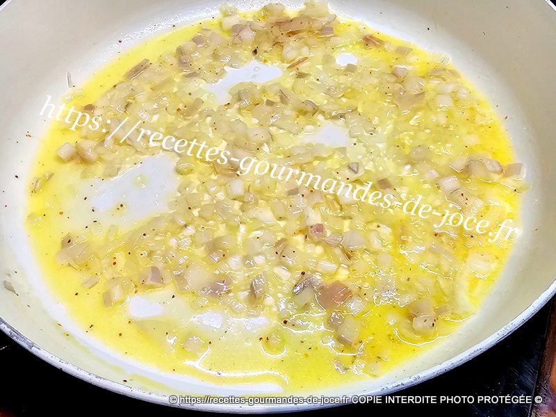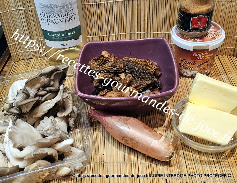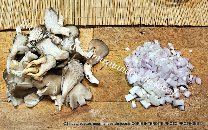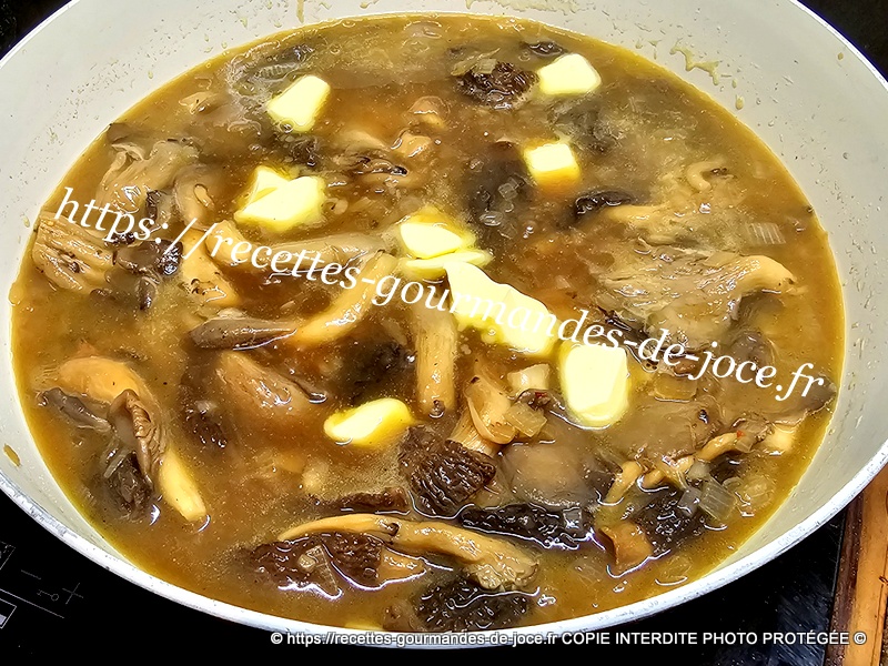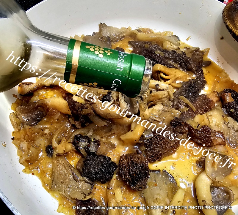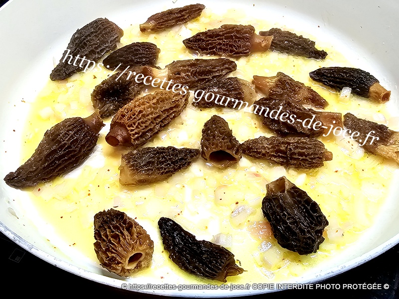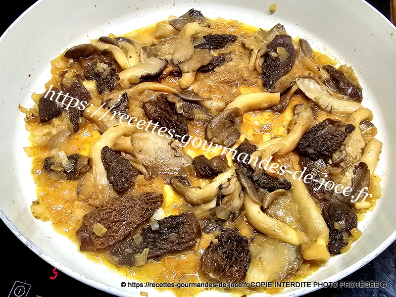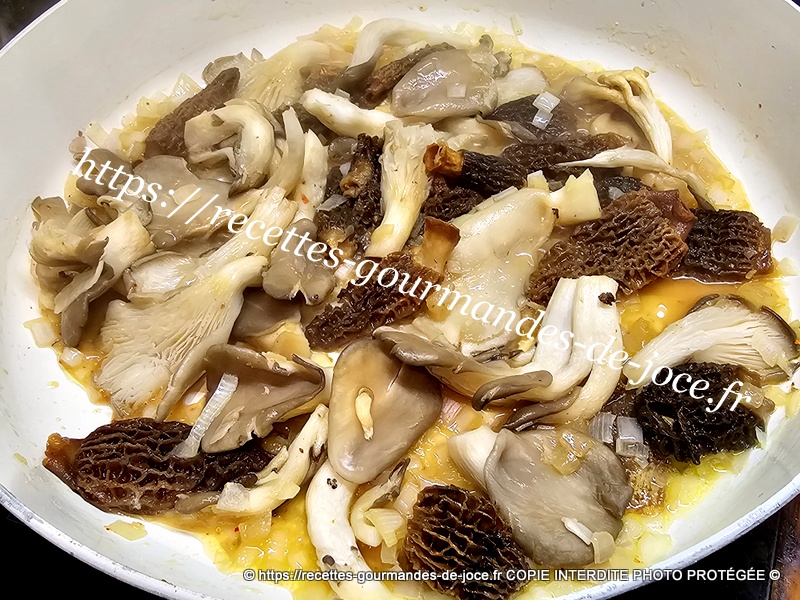 Le faire suer sans coloration, ajouter ensuite les morilles et les faire également suer à feu moyen pendant environ 5 minutes, ajouter ensuite les pleurotes, mélanger.