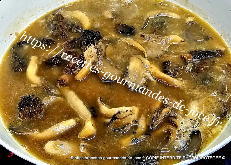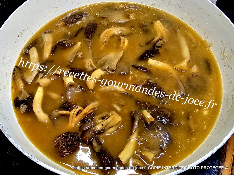 Ajouter ensuite le vin blanc et mélanger, laisser mijoter toujours à feu moyen pendant 10 minutes en remuant (le temps de cuisson est important pour les morilles.). Ajouter ensuite le fond de veau et mélanger. Laisser encore mijoter 10 minutes à feu doux en remuant de temps en temps.