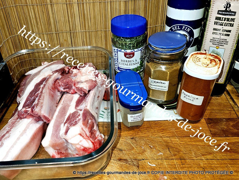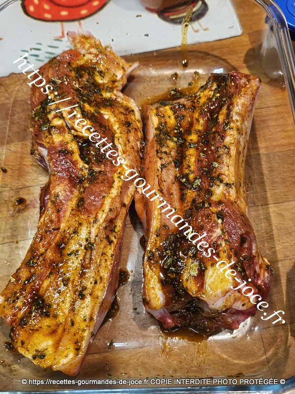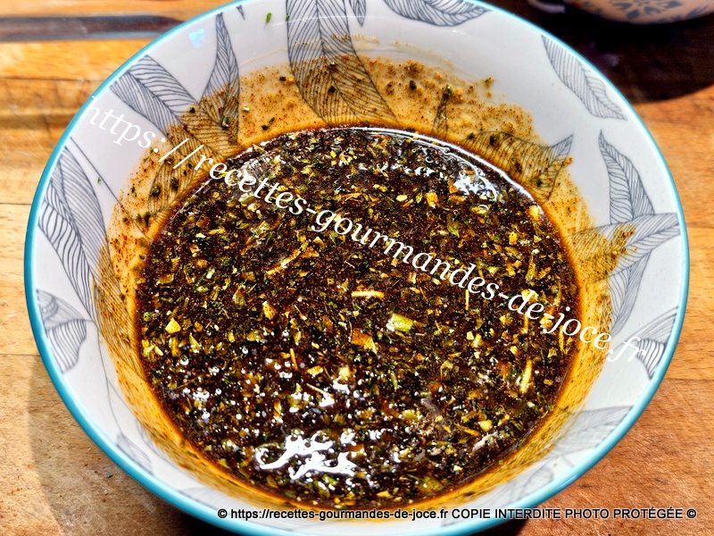 Couvrir les ingrédients à hauteur d’huile d’olive et bien mélanger. Verser la marinade sur les morceaux de poitrine de porc.