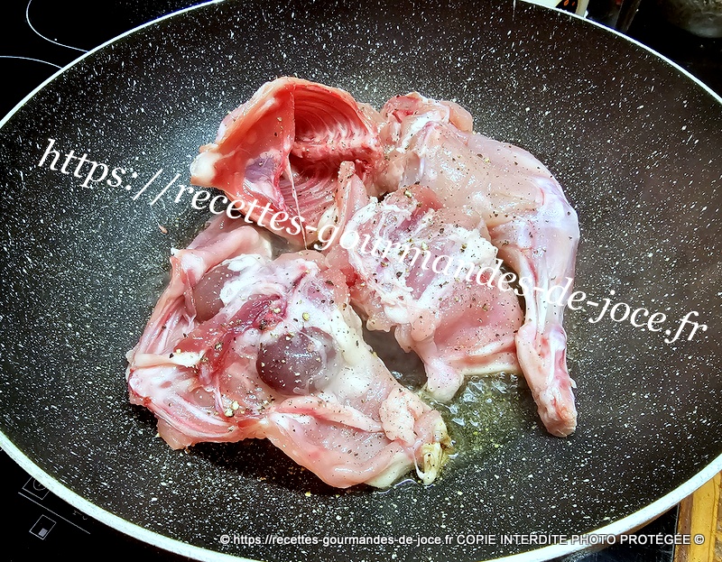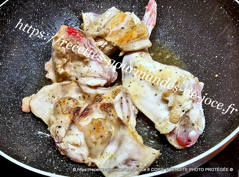 Dans une poêle mettre un filet d’huile d’olive à chauffer sans la faire fumer. Ajouter les morceaux de lapin, saler et poivrer et les faire dorer sur toutes les faces.
