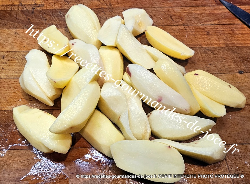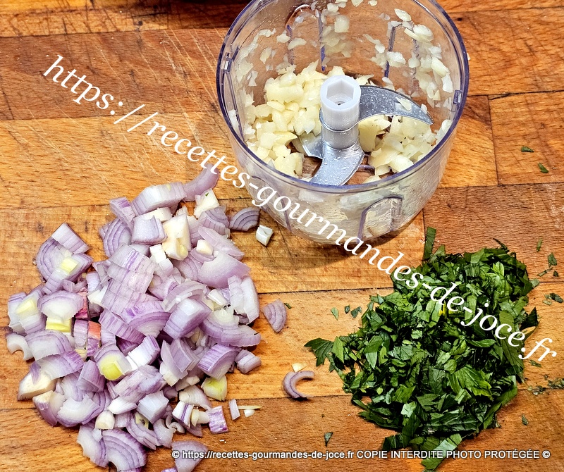 Peler et laver les pommes de terre et les couper en deux dans le sens de la longueur, peler et hacher les échalotes et les gousses d’ail dégermées, laver et ciseler le persil. Dissoudre le cube de bouillon de volaille dans environ 700 ml d’eau chaude.