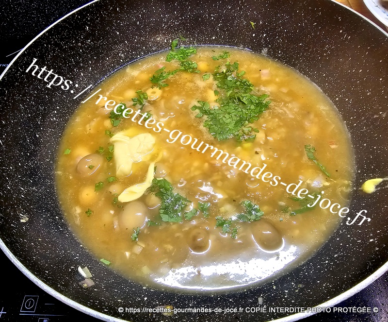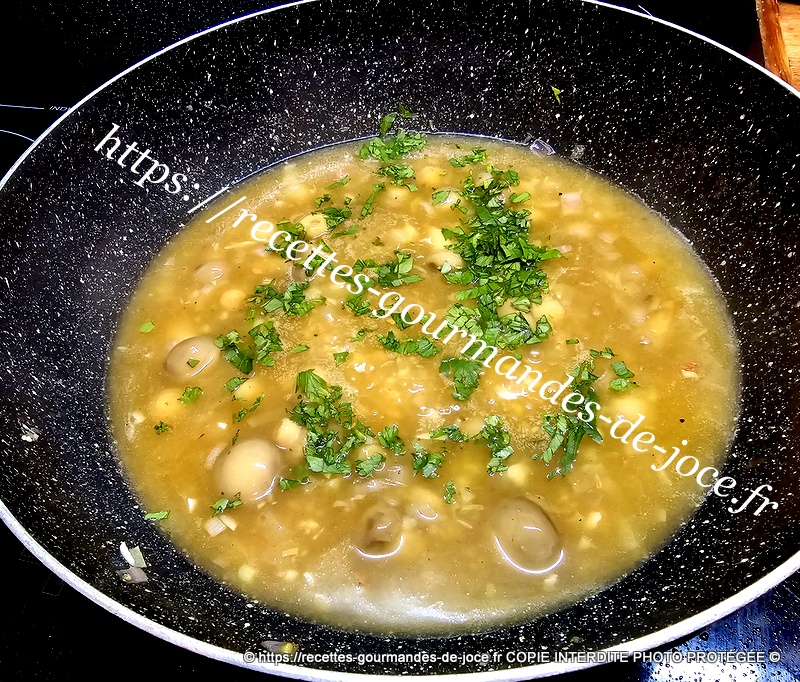 Ajouter ensuite le fond de volaille. Bien mélanger puis verser le bouillon, bien remuer, ajouter la moitié du persil.