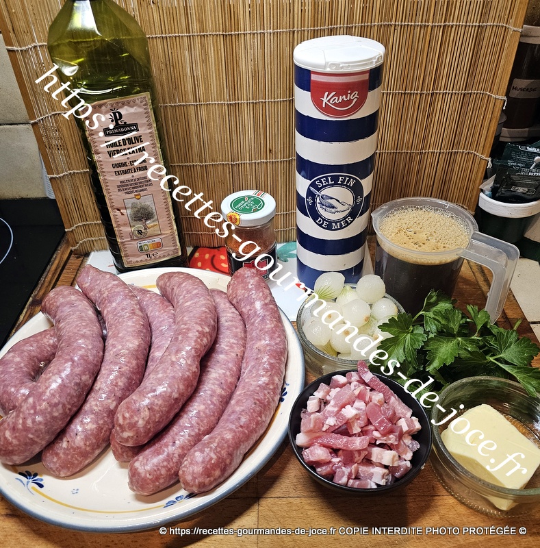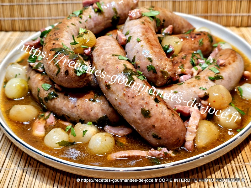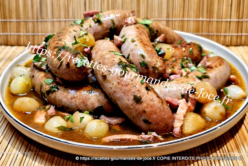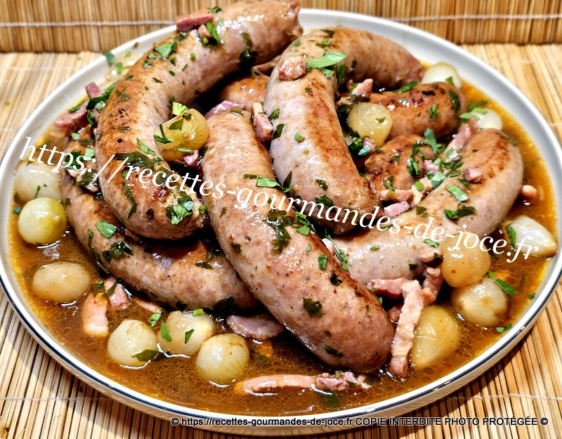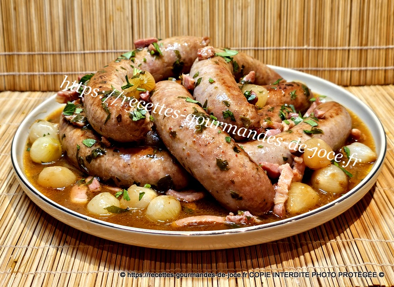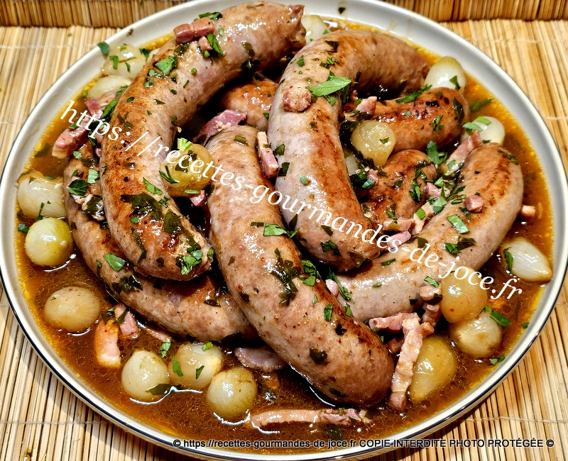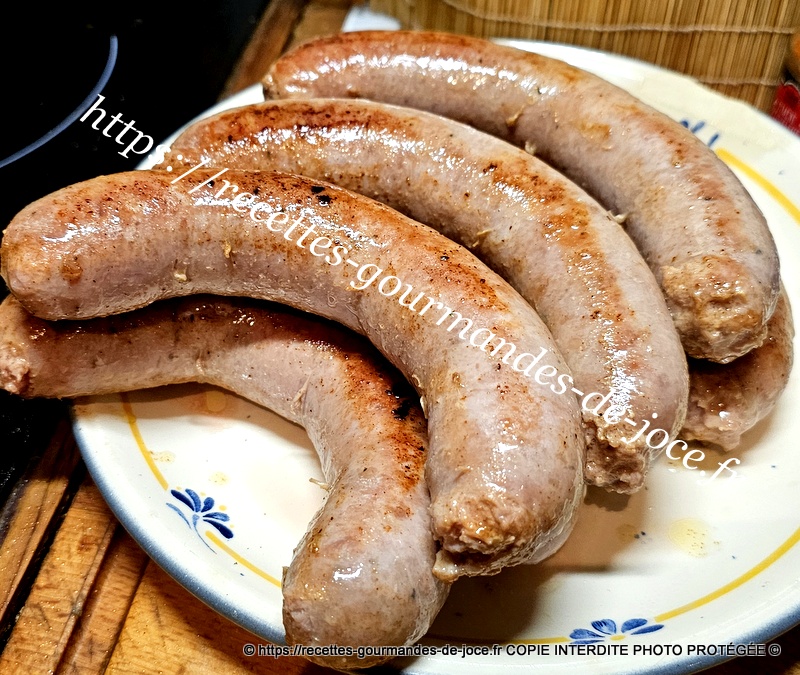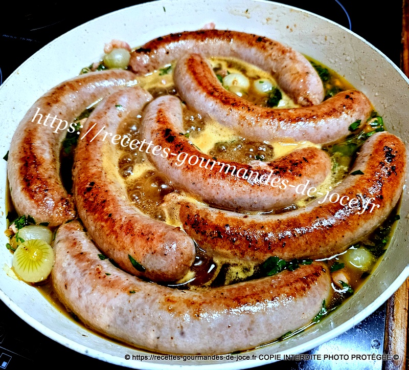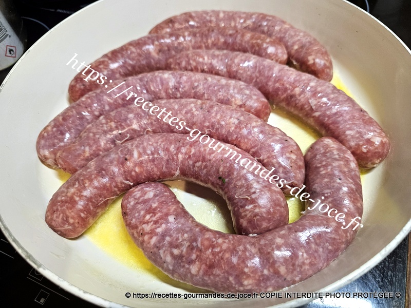 Les faire dorer, ajouter le piment d’Espelette, saler très légèrement, poivrer, verser ensuite le fond de veau réhydraté dans les 250 ml d’eau chaude, mélanger, laisser épaissir 2 minutes, ajouter le persil, mélanger puis remettre les saucisses et le jus qu’elles auront rendu, laisser mijoter à feu moyen environ 25 minutes en les retournant de temps en temps. Servir avec une bonne purée maison.