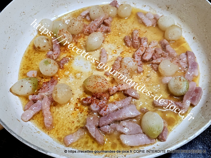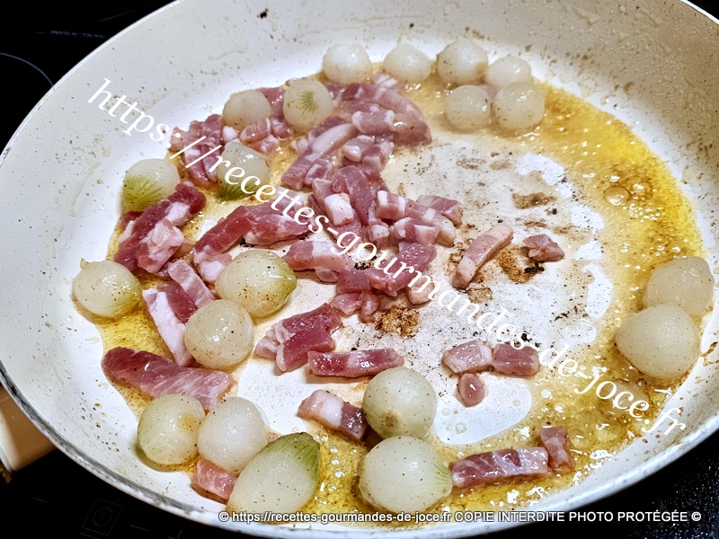 Lorsqu’elles sont bien dorées, les débarrasser. À la place, ajouter les oignons et les lardons