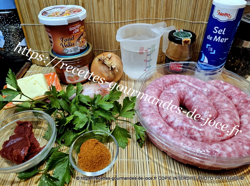Peler et émincer l’oignon et l’échalion, laver et ciseler le persil, dissoudre de fond de veau dans 200 ml d’eau chaude. Si c’est une grande saucisse la couper en 6 morceaux. Dans une poêle, mettre le beurre a fondre avec un léger filet d’huile d’olive.