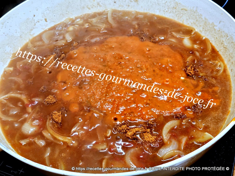 Ajouter le concentré de tomate et mélanger à nouveau. Ajouter ensuite les épices et le piment d’Espelette, la sauce tomate.