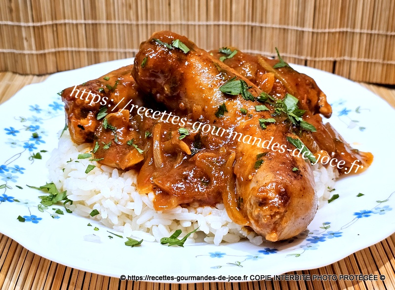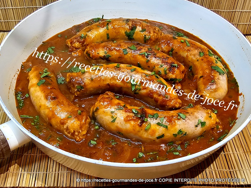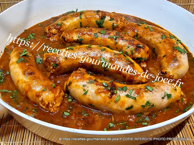 Mélanger et laisser mijoter 2 minutes, ajouter les saucisses, la moitié du persil et laisser mijoter 10 minutes à feu doux, puis les retourner laisser encore mijoter 5 minutes et parsemer le reste du persil avant de servir avec par exemple du riz.