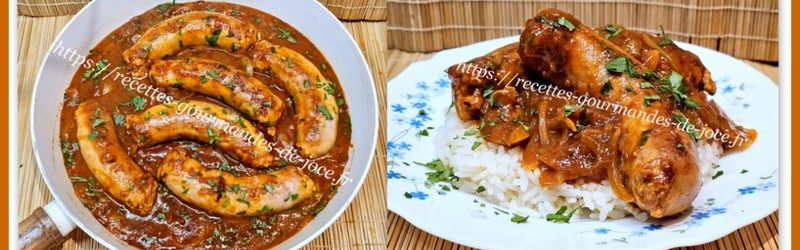 Saucisses de Toulouse épicées aux oignons, sauce tomate.