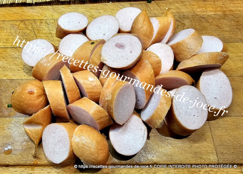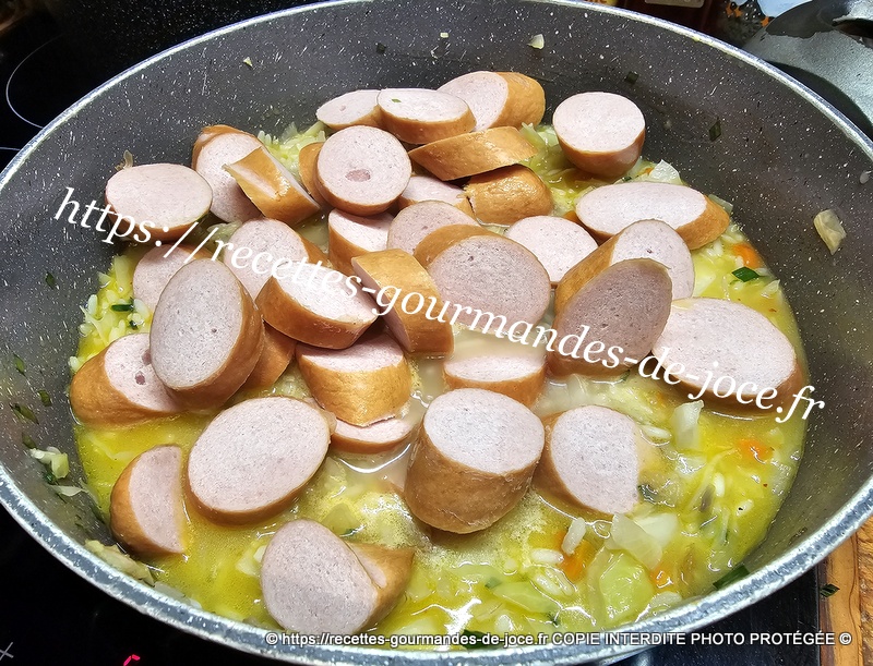 Couper les saucisses en tranches. Peler et couper les carottes en petits dés, peler et hacher l’oignon, laver et ciseler le persil ou comme moi la ciboulette, nettoyer et émincer finement le chou. Dissoudre le cube de bouillon de volaille dans 1 litre d’eau chaude. Dans une cocotte, mettre un filet d’huile d’olive.