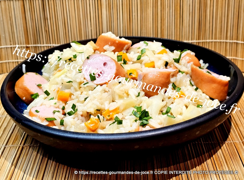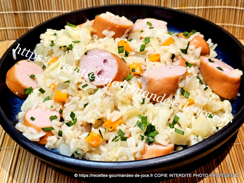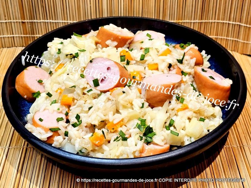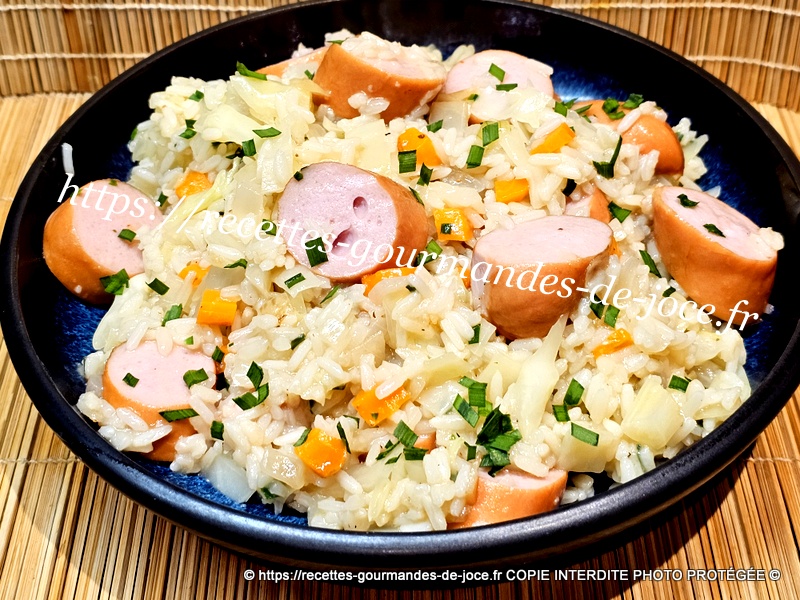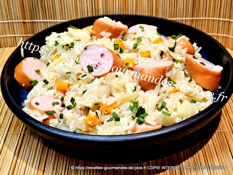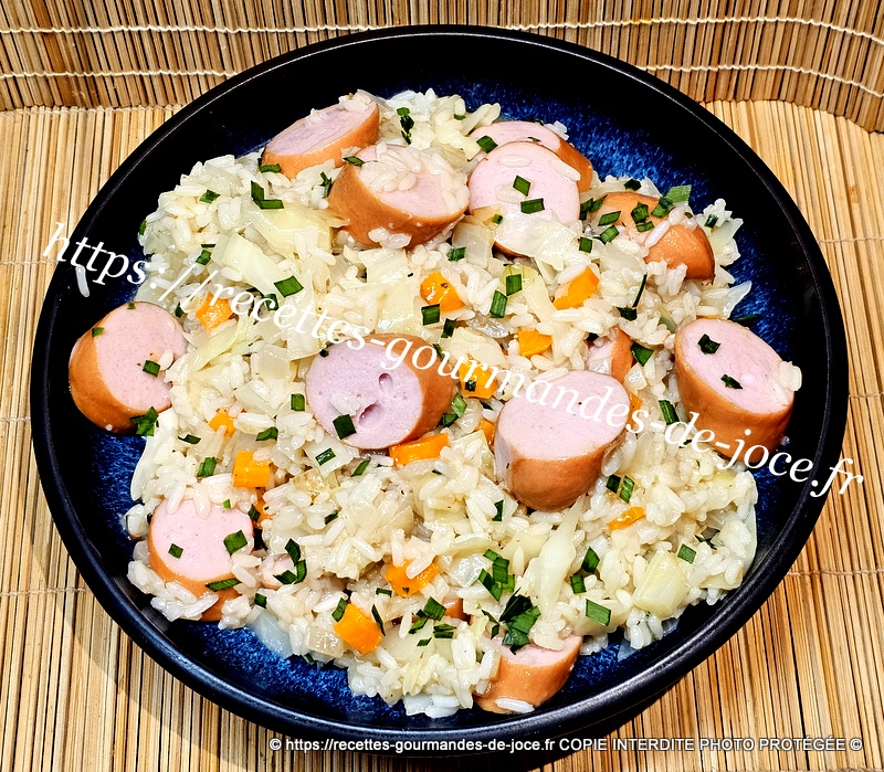 Aux ¾ de la cuisson du riz ajouter les saucisses et terminer la cuisson. Lorsqu’il est cuit, ajouter le persil ou la ciboulette, mélanger et servir sans attendre.