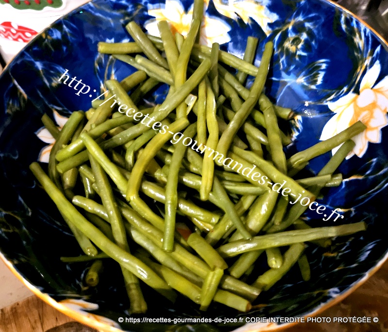 Équeuter les haricots et les laver. Mettre les haricots à cuire dans une marmite d’eau salée, les cuire selon vos goûts pour nous bien cuits. Lorsqu’ils sont cuits les égoutter et les réserver au chaud.