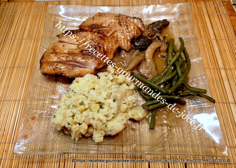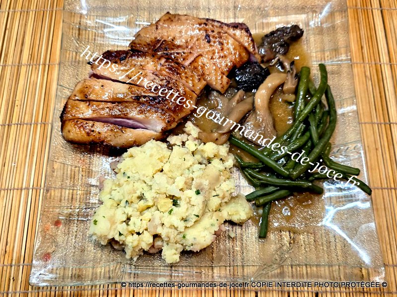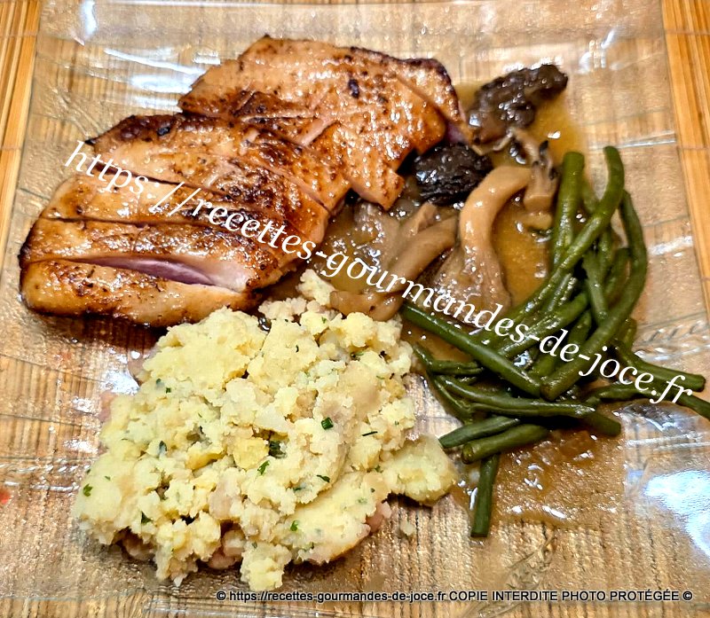 Il ne vous reste plus qu’à accompagner votre magret de la sauce aux champignons, de l’écrasé de pommes de terre et de haricots verts.