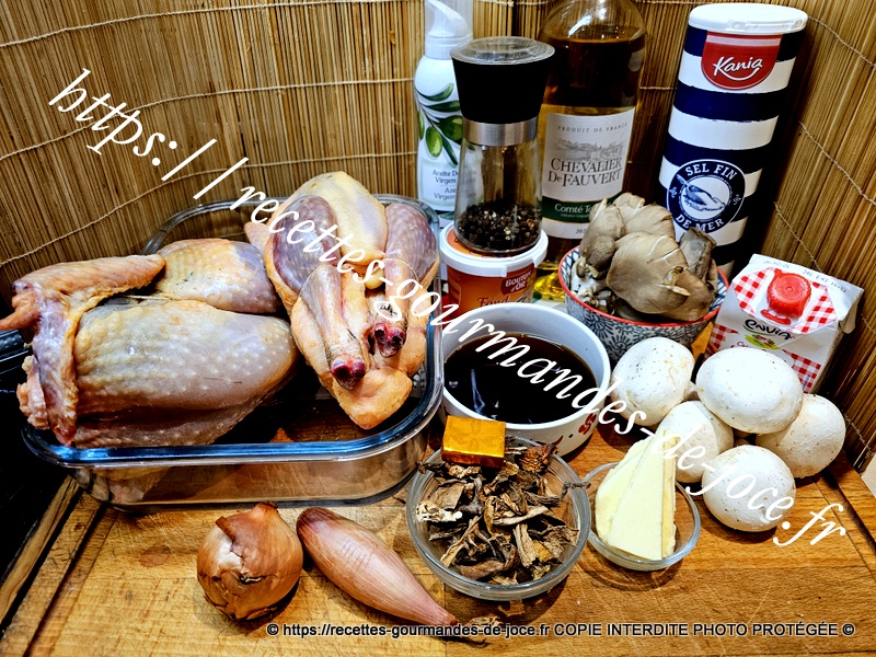 Peler et émincer l’oignon et l’échalion. Nettoyer les champignons, couper les champignons de Paris en 4, les lamelles de pleurotes en deux si elles sont grosses, mettre à réhydrater les cèpes dans de l’eau chaude, puis les égoutter (gardez l’eau de réhydratation qui est parfumée).