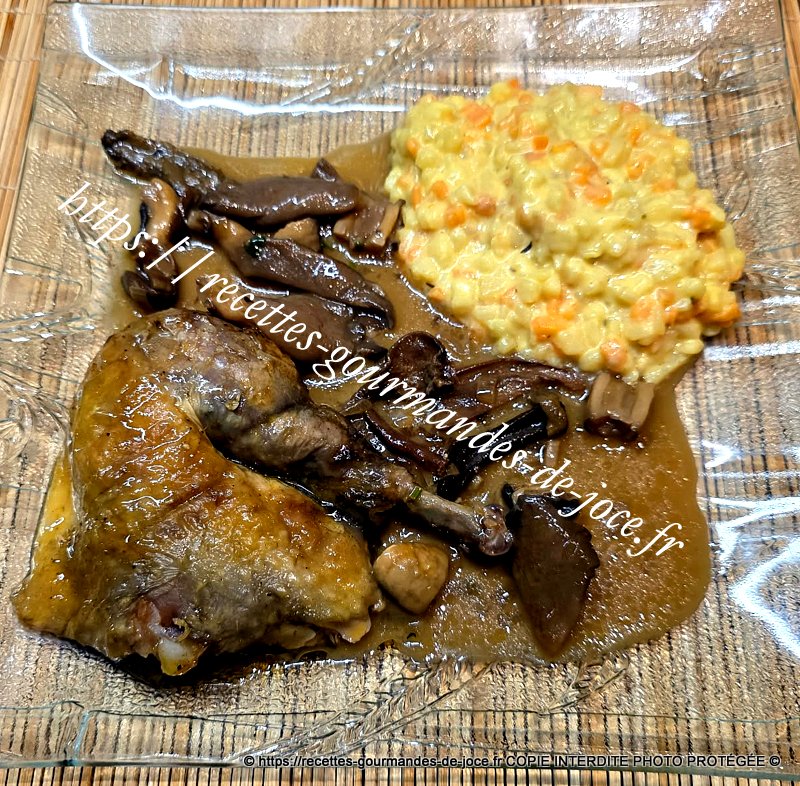 Pintades rôties, sauce forestière, risotto de pommes de terre et carottes.