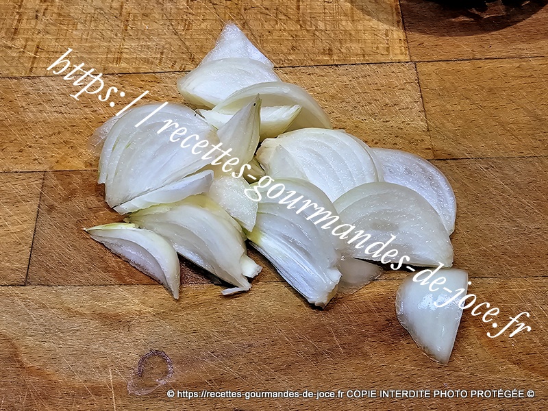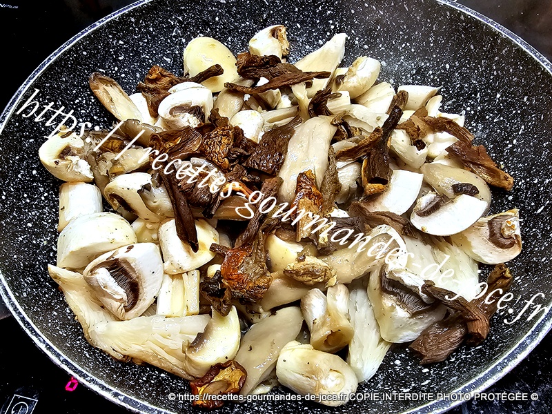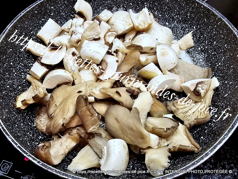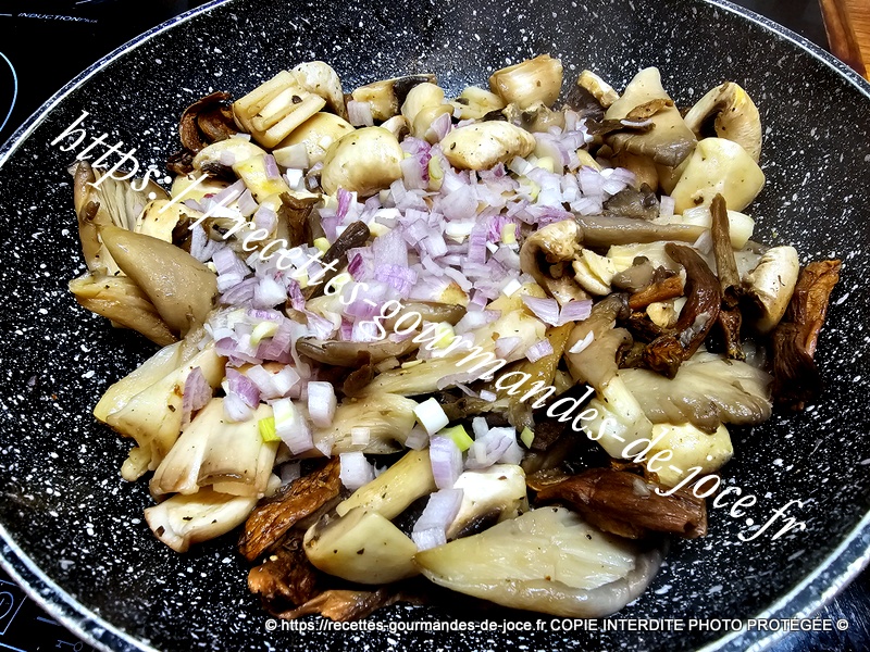Peler et émincer l’oignon et l’échalion. Nettoyer les champignons, couper les champignons de Paris en 4, les lamelles de pleurotes en deux si elles sont grosses, mettre à réhydrater les cèpes dans de l’eau chaude, puis les égoutter (gardez l’eau de réhydratation qui est parfumée).
