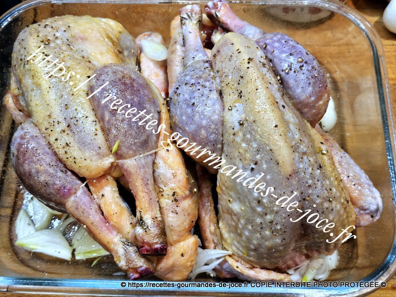 Dissoudre le cube de bouillon de volaille dans 400ml d’eau chaude. Mettre les pintades dans un plat, répartir autour les oignons, saler et poivrer.
