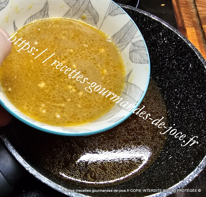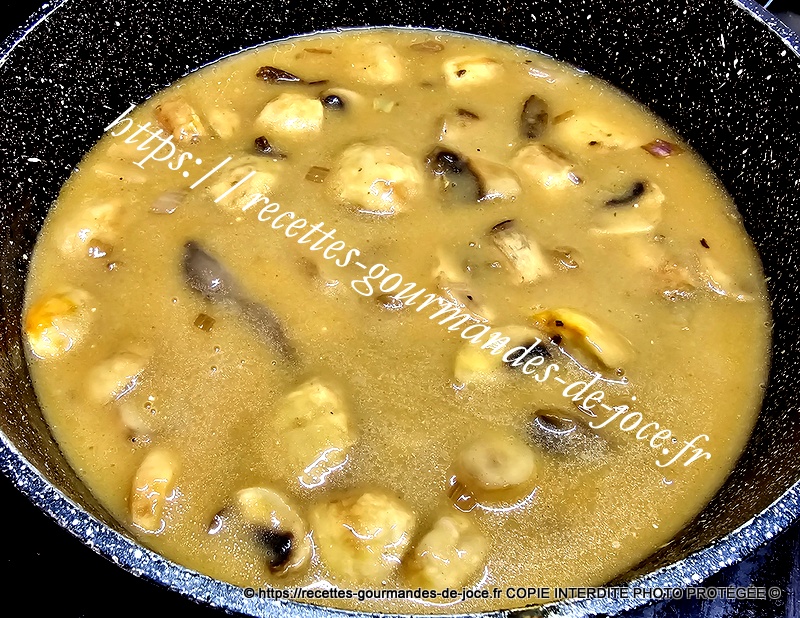 Ajouter dans le bol le fond de volaille et bien mélanger puis le verser dans la casserole avec le jus de cuisson.
