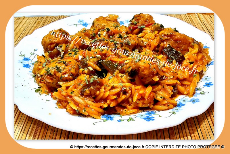 Boulettes de poulet épicées au paprika fumé, pâtes risetti, ratatouille et sauce tomate.