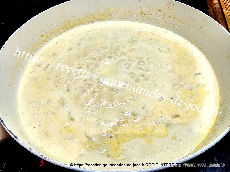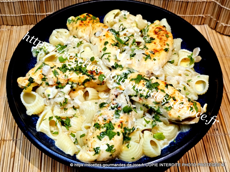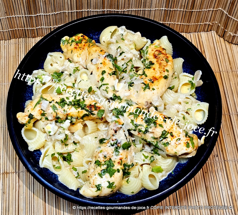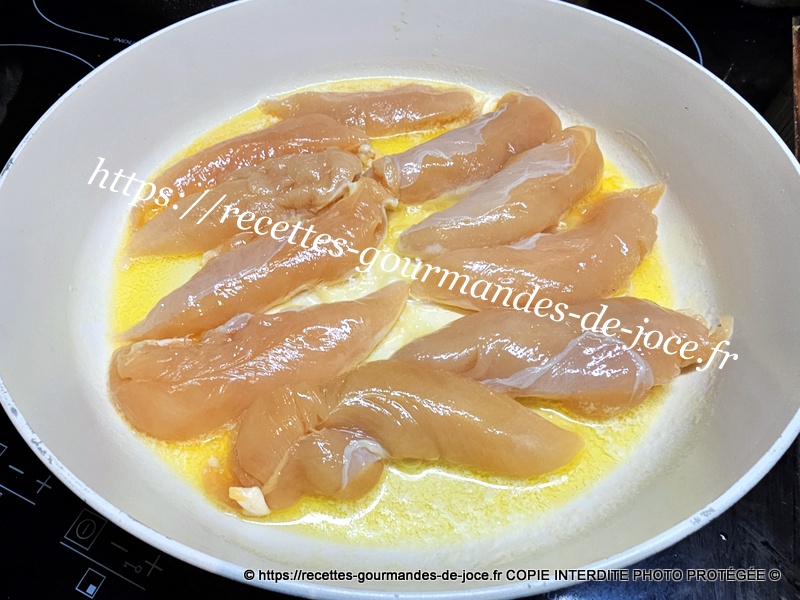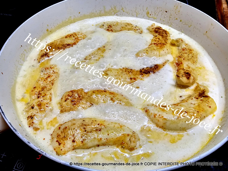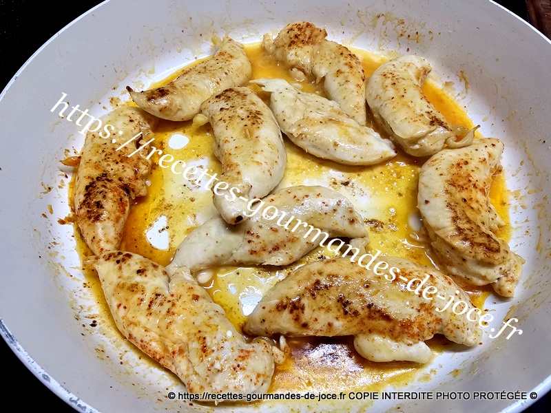 Mélanger à nouveau, ajouter les aiguillettes de poulet et le jus qu’elles auront rendu et laisser mijoter 5 minutes à feu doux. Égoutter les pâtes lorsqu’elles sont cuites.