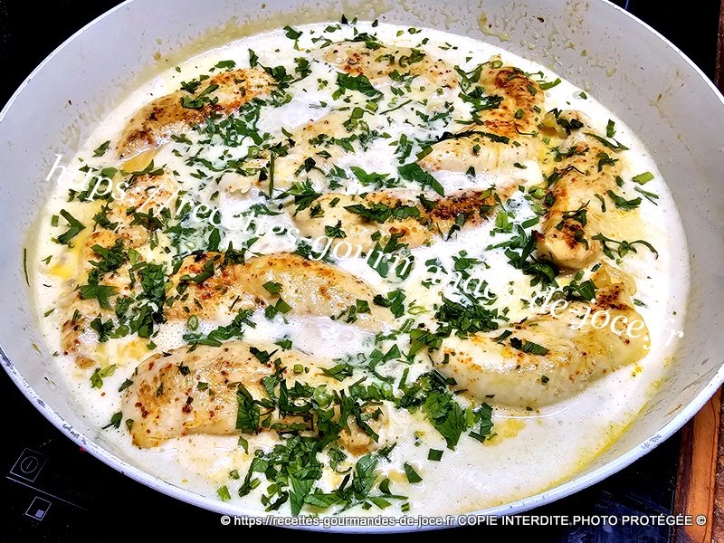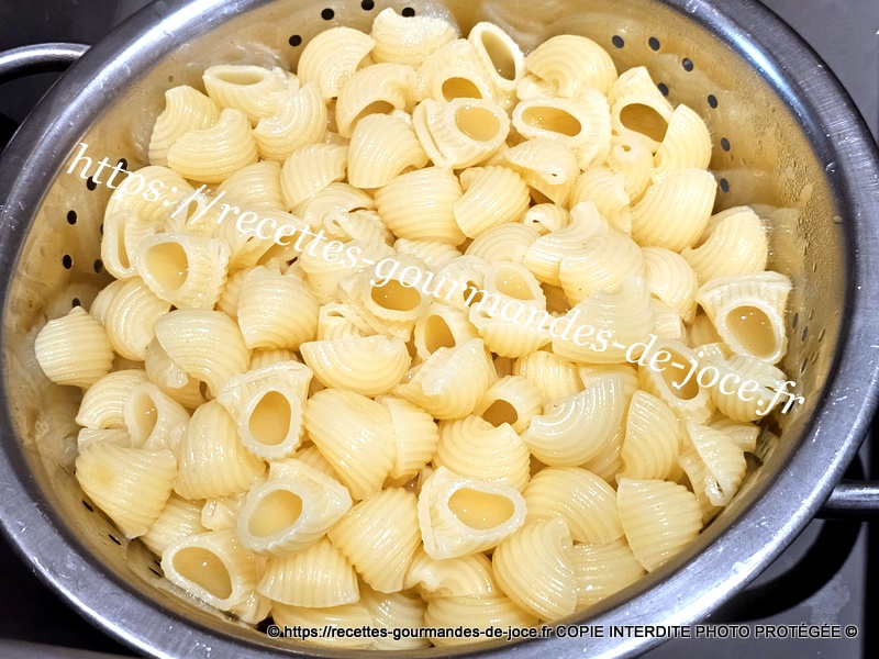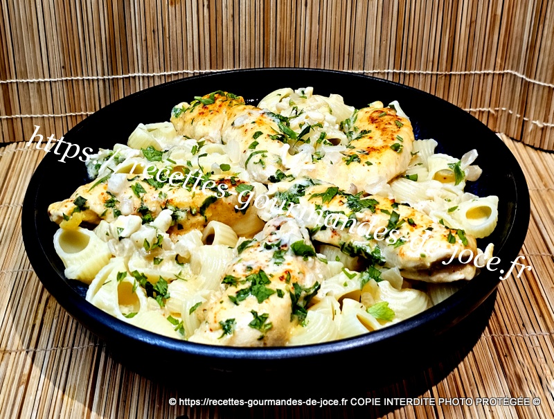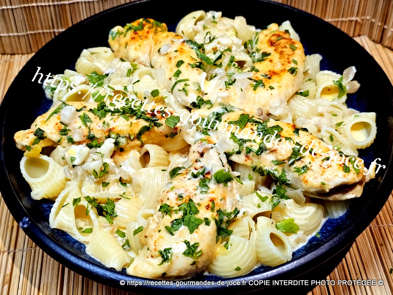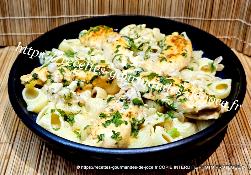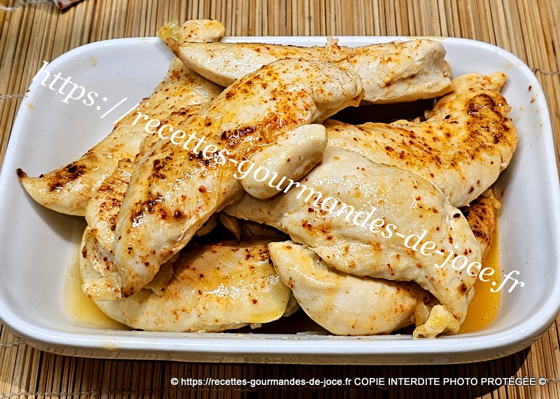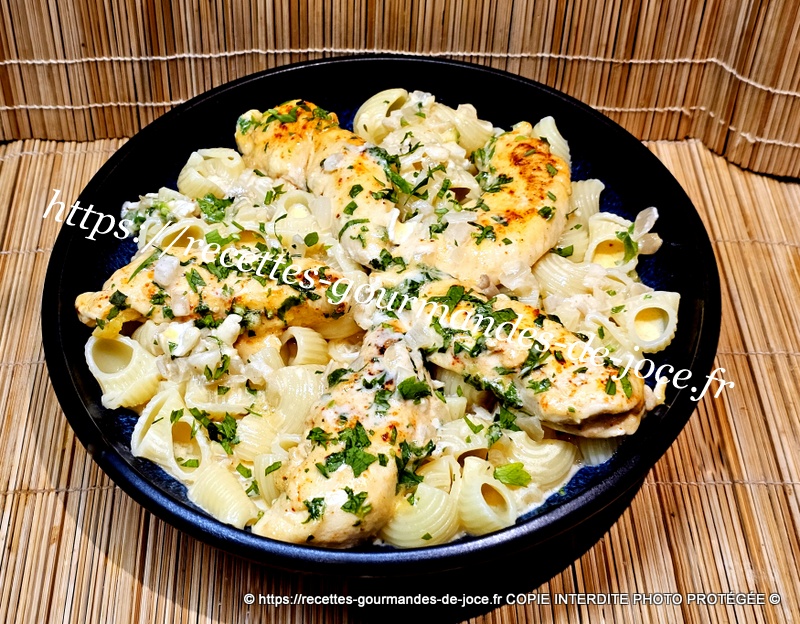 Mélanger à nouveau, ajouter les aiguillettes de poulet et le jus qu’elles auront rendu et laisser mijoter 5 minutes à feu doux. Égoutter les pâtes lorsqu’elles sont cuites.