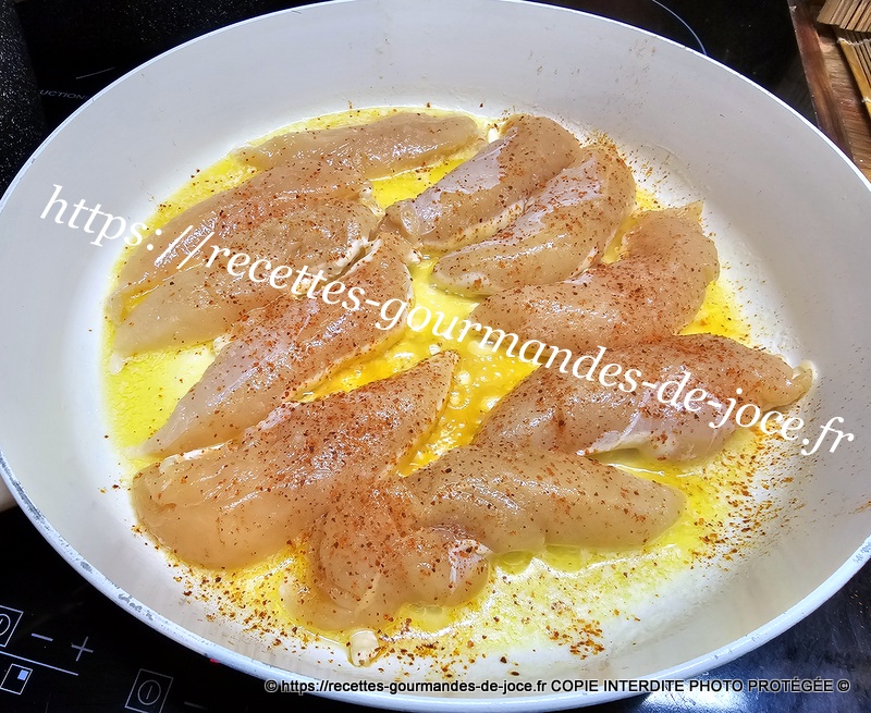 Pendant la cuisson des pâtes, mettre le beurre à fondre dans une poêle, Ajouter les aiguillettes et les saler, ajouter le piment d’Espelette.