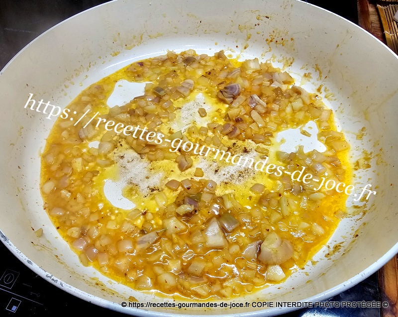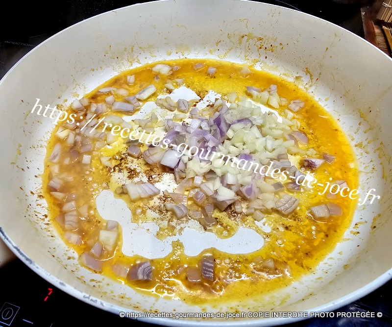 Les cuire et les retournant régulièrement, lorsqu’elles sont cuites les débarrasser, à la place mettre l’échalion et les gousses d’ail à suer.