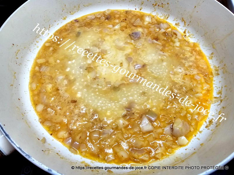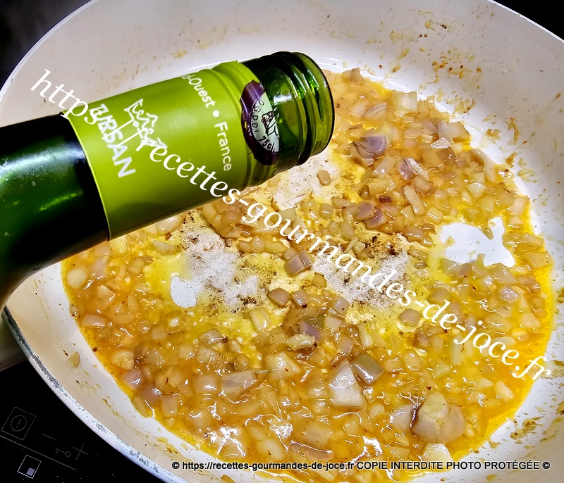 Lorsqu’elles commencent à dorer ajouter le vin blanc, mélanger et laisser réduire de moitié.