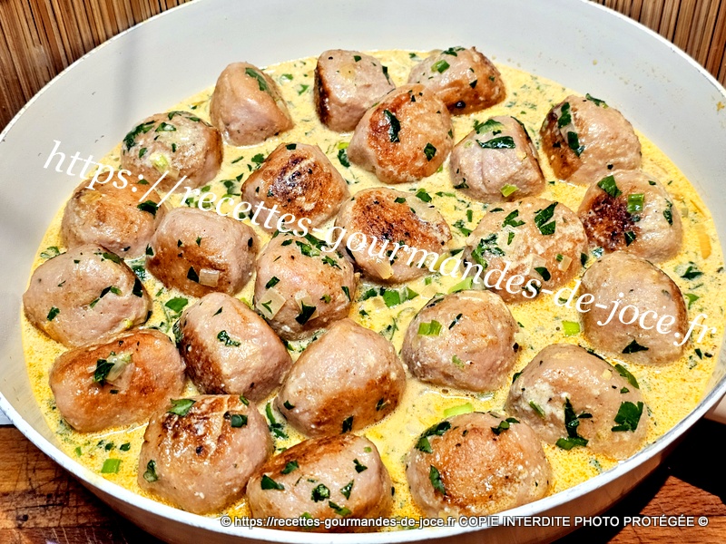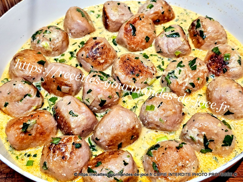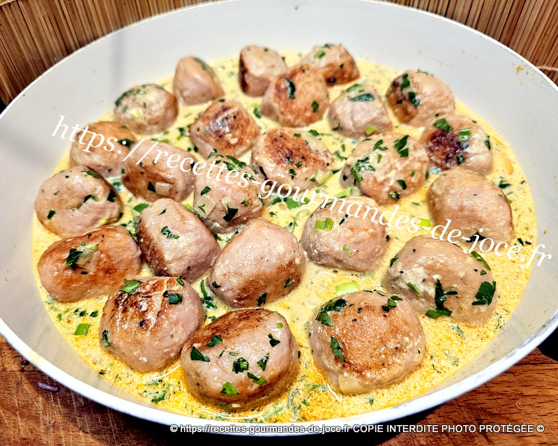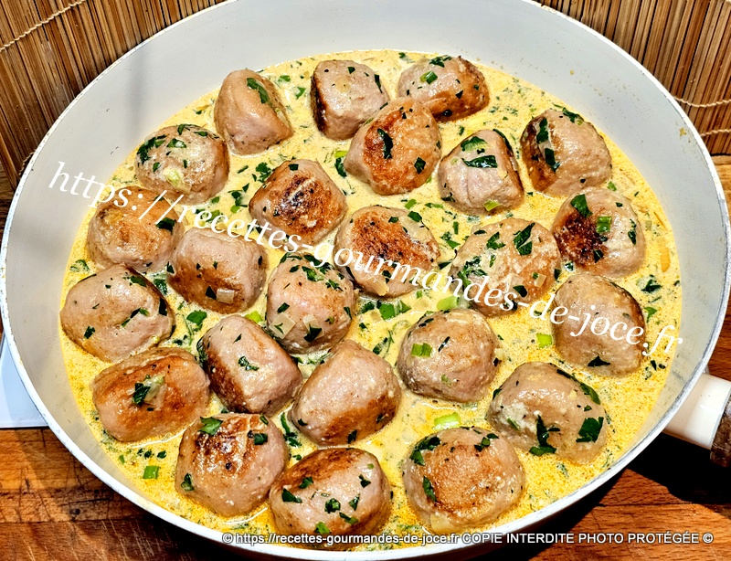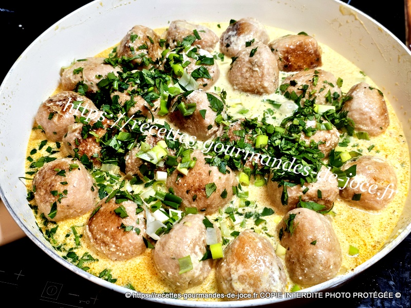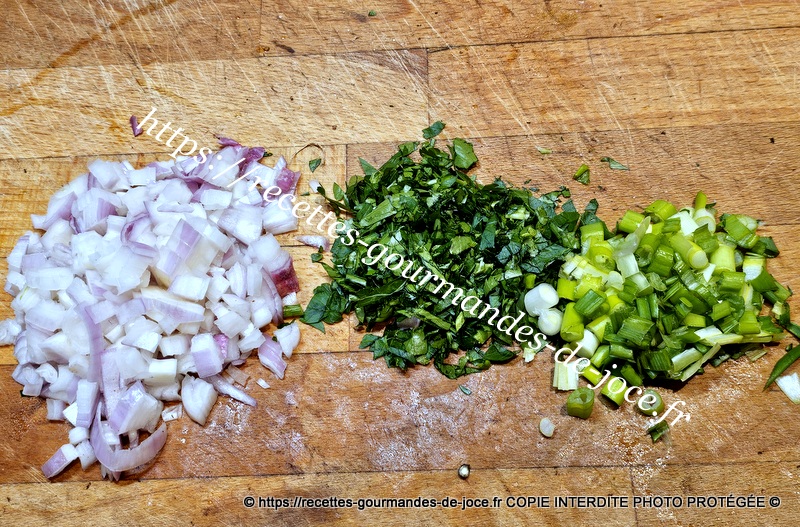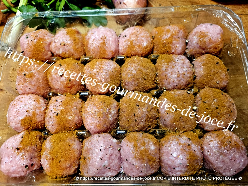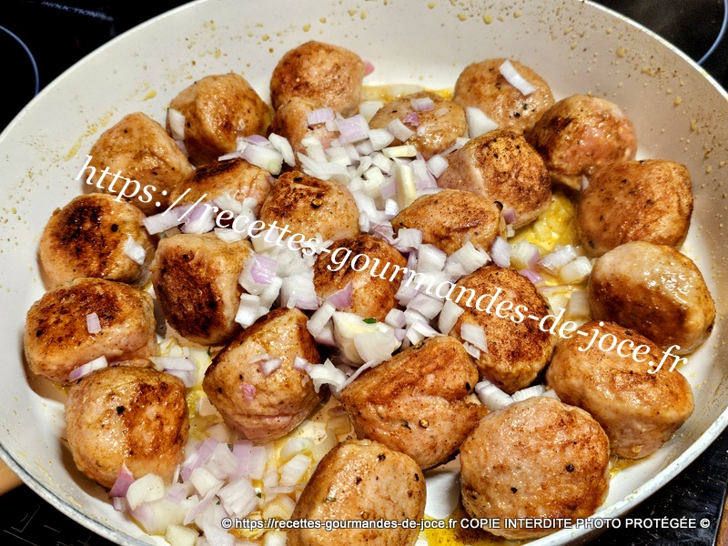 Peler et hacher l’échalion ou les échalotes, laver et ciseler le persil et les cébettes. Saler et poivrer les boulettes, ajoute 1 c à s d’épices. Dans une poêle mettre le beurre et un filet d’huile d’olive à chauffer.