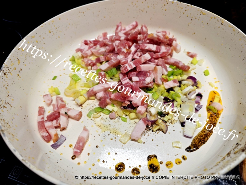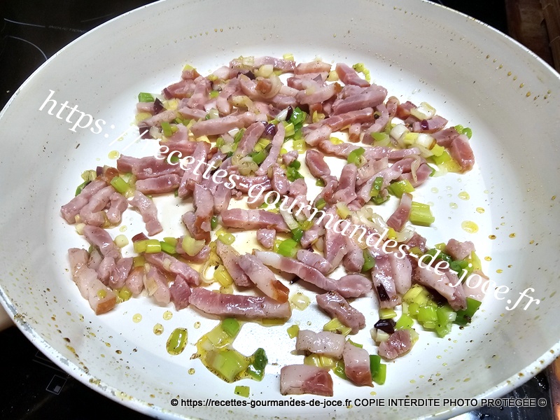 Les faire dorer sur toutes les faces puis les débarrasser. Ajouter à la place les oignons et les lardons.