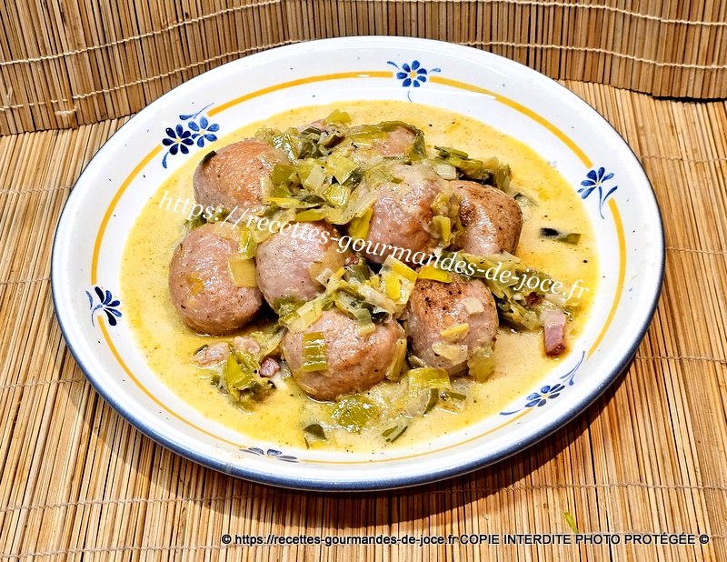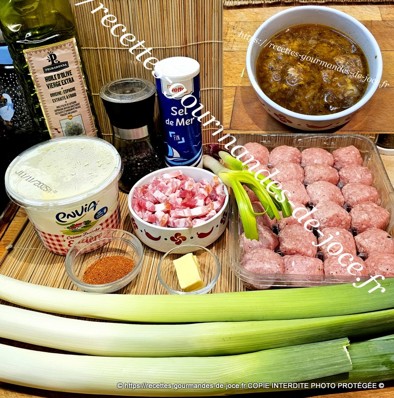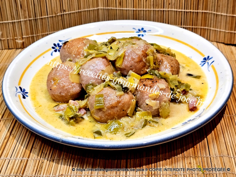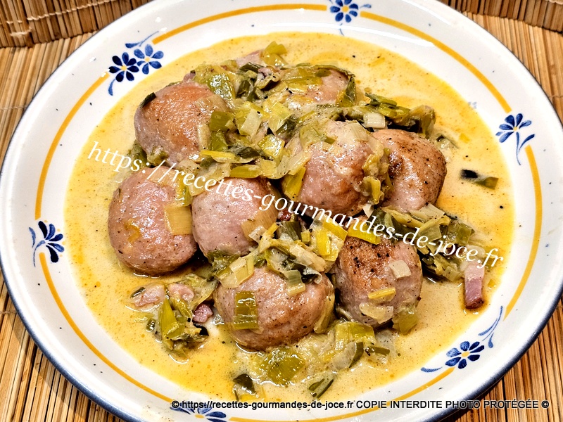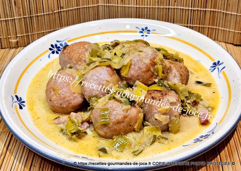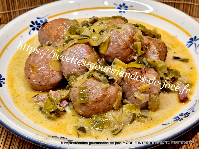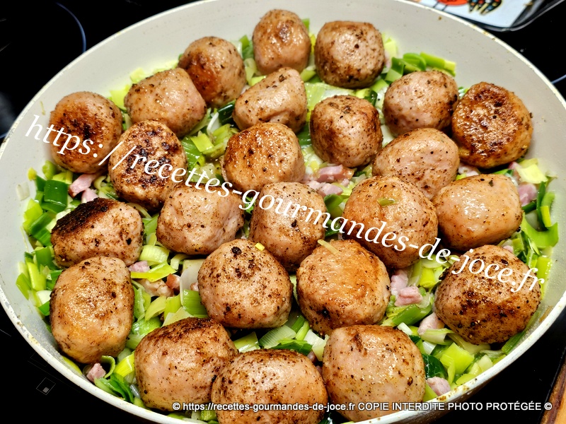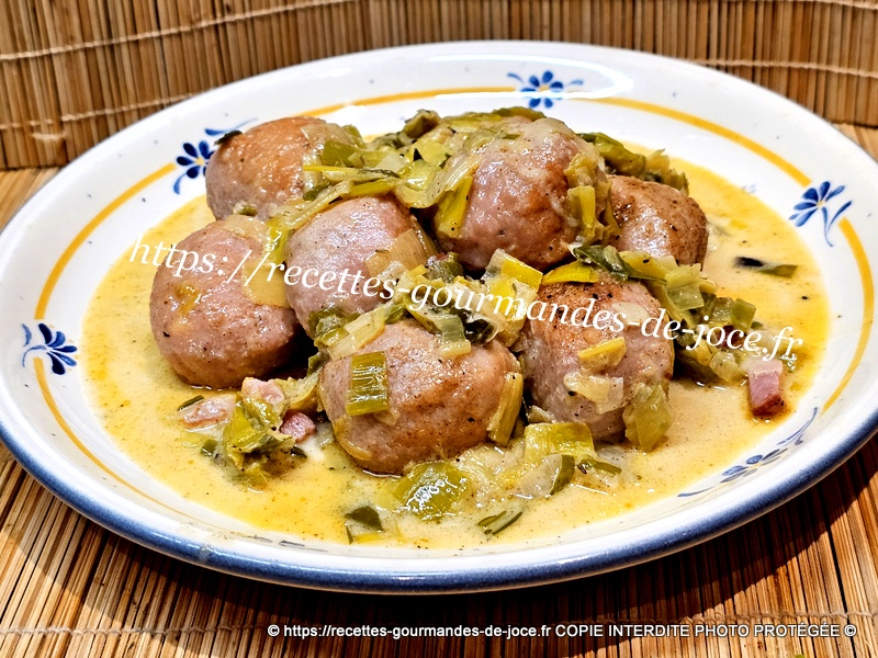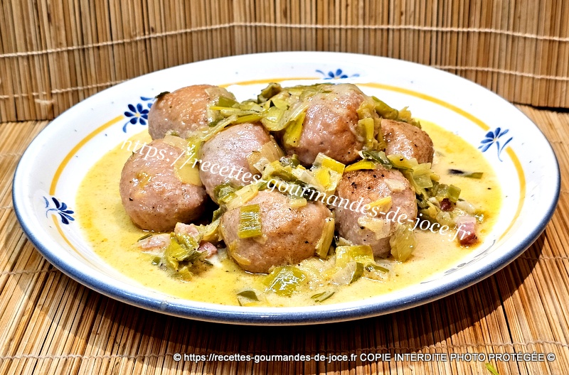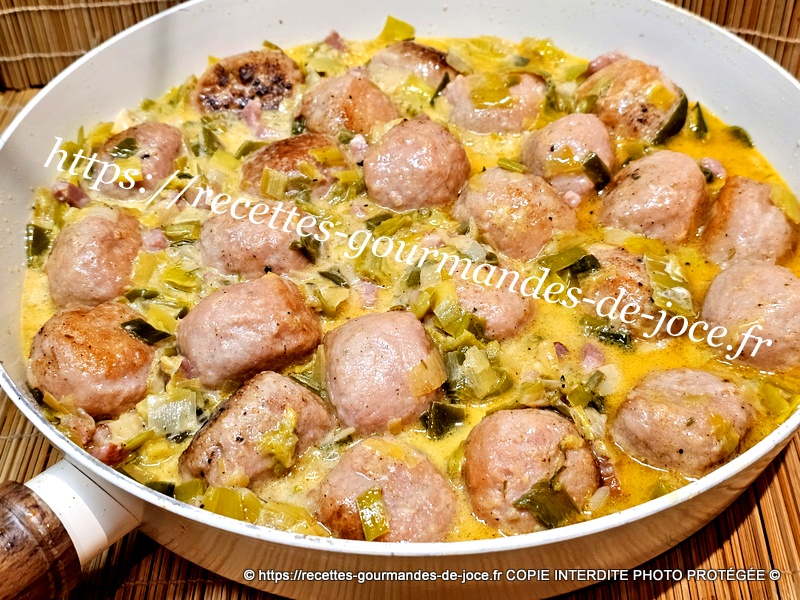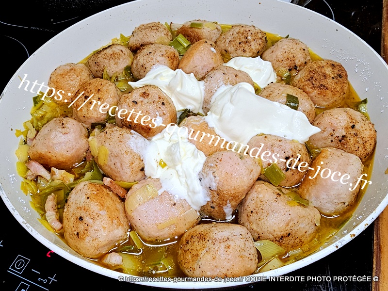 Mettre un couvercle et laisser mijoter environ 35 minutes à feu doux, remuer de temps en temps. Lorsque les poireaux sont cuits (les boulettes le seront aussi) ajouter la crème fraîche et mélanger, laisser encire 2 minutes chauffer et servir sans attendre.