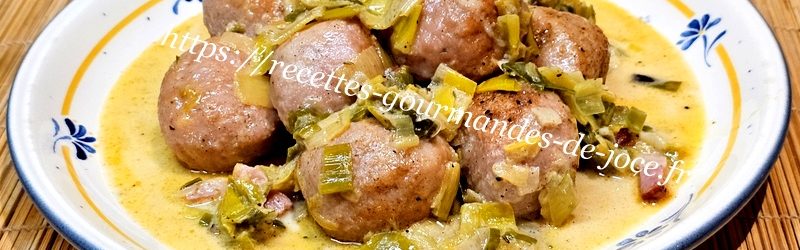 Boulettes de poulet épicées à la fondue de poireaux aux lardons, crémée.