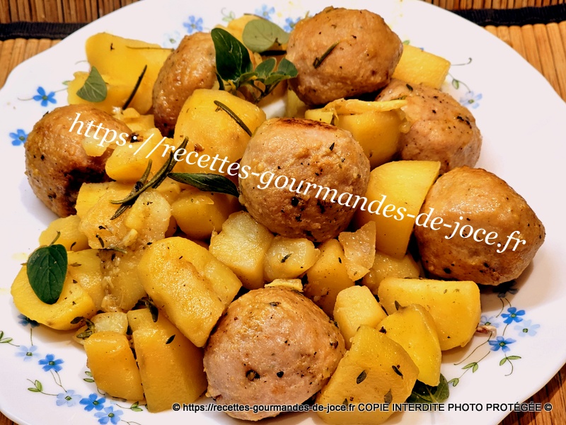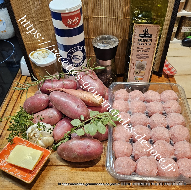 Peler, laver et couper les pommes de terre en morceaux, peler et émincer l’ail dégermée, peler et hacher l’échalote si elle est fraîche. Laver et effeuiller les herbes aromatiques. Dans une sauteuse, mettre le beurre et un filet d’huile d’olive à chauffer, puis ajouter les boulettes.