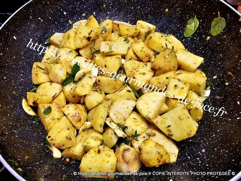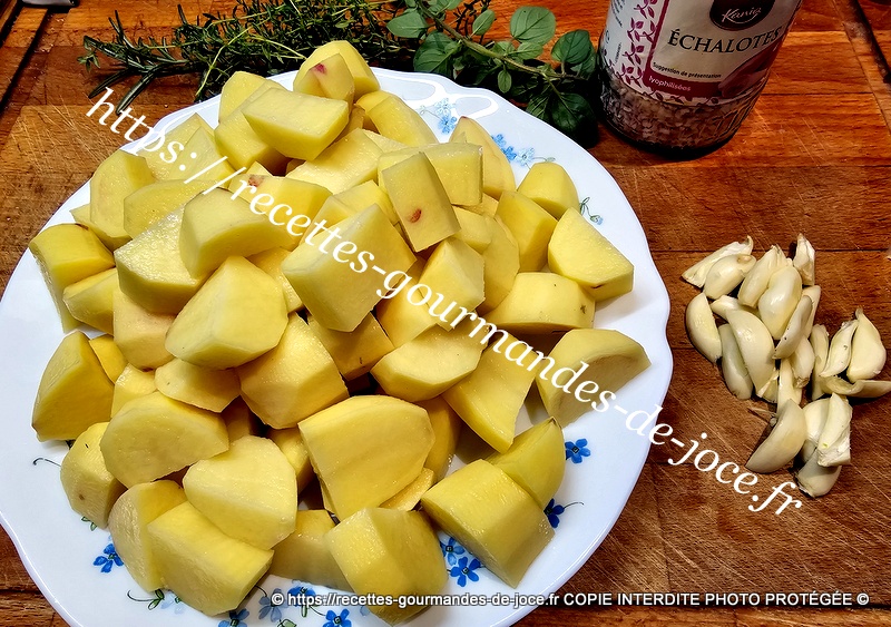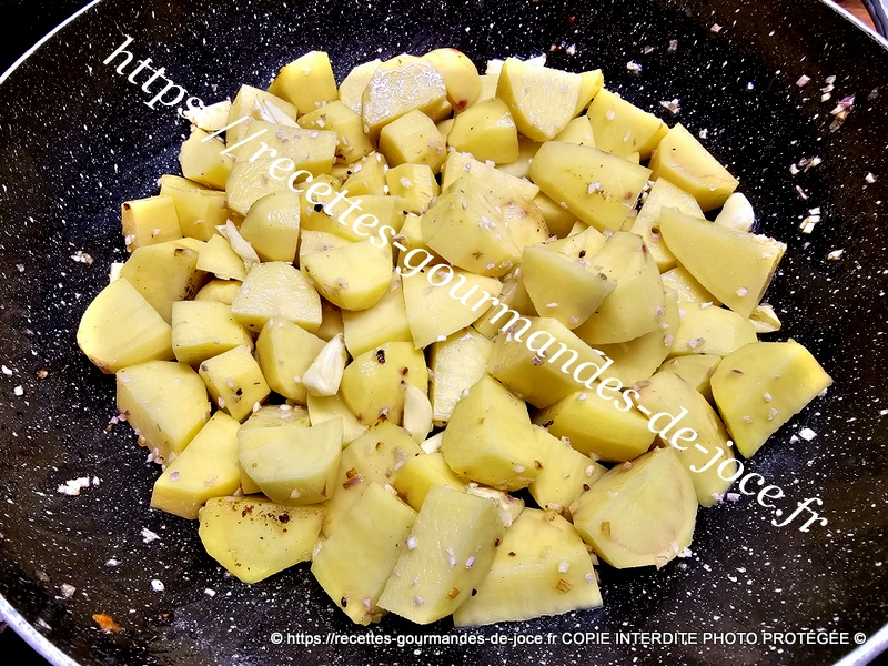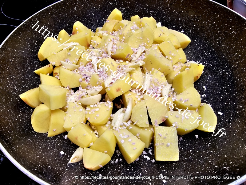 À la place mettre les pommes de terre, saler et poivrer et ajouter l’ail et l’échalote. Mélanger.