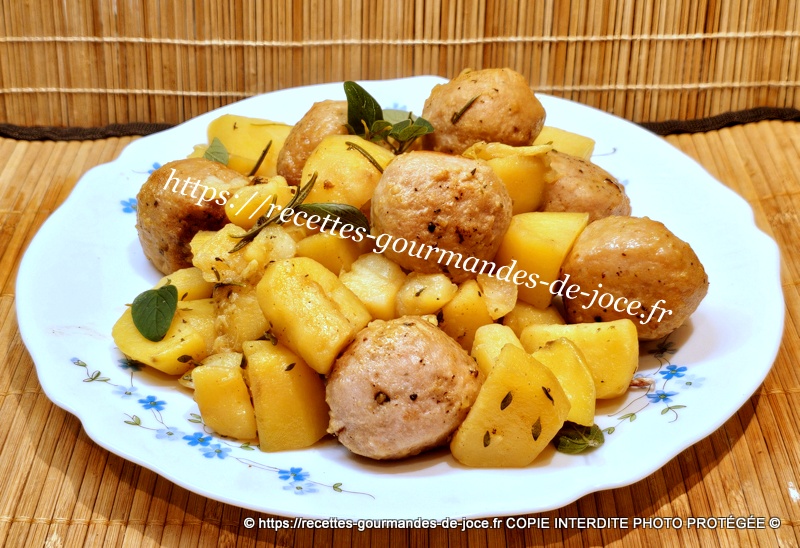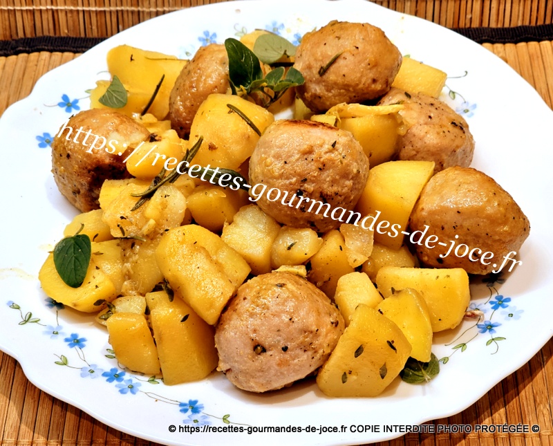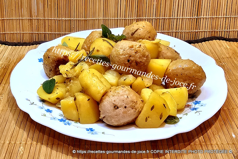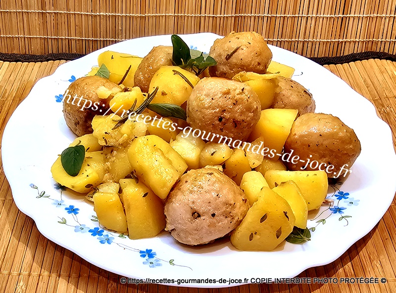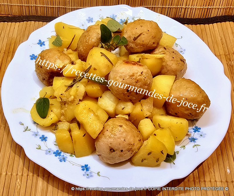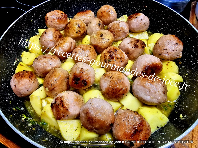 Ajouter ensuite de l’eau aux ¾ de la hauteur des pommes de terre et mélanger, remettre les boulettes et le jus qu’elles auront rendu dessus.