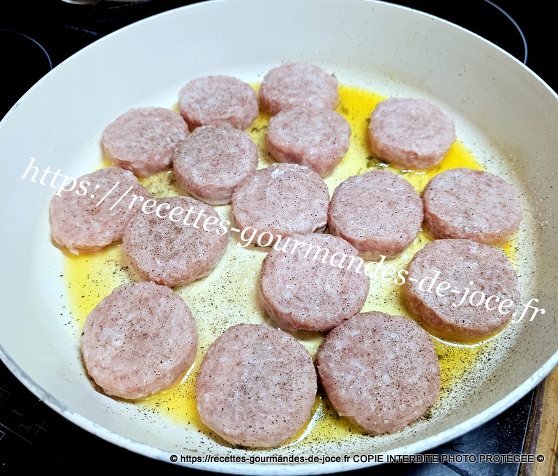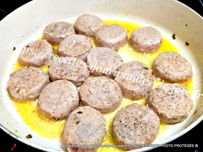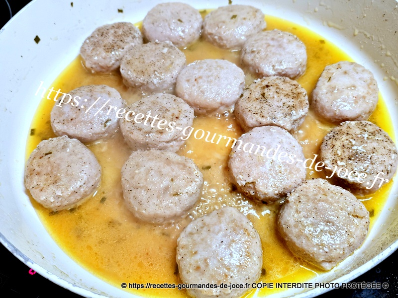 Lorsque le beurre est fondu, mettre les boulettes de poulet à colorer légèrement, les saler et poivrer, ajouter ensuite 100 ml d’eau environ pour déglacer les sucs de cuisson.