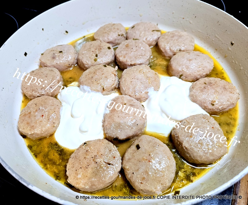 Ajouter 3 c à s de marinade, mélanger et laisser mijoter selon la grosseur des boulettes environ 15/20 minutes à feu doux en les retournant de temps en temps. Lorsqu’elles sont cuites, ajouter la crème, mélanger, laisser réchauffer quelques instants et servir sans attendre avec soit du riz ou encore des haricots verts.