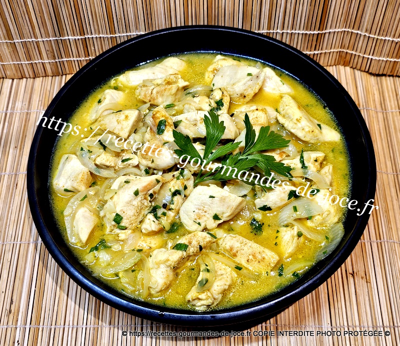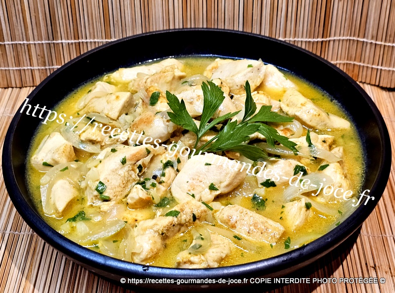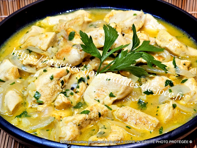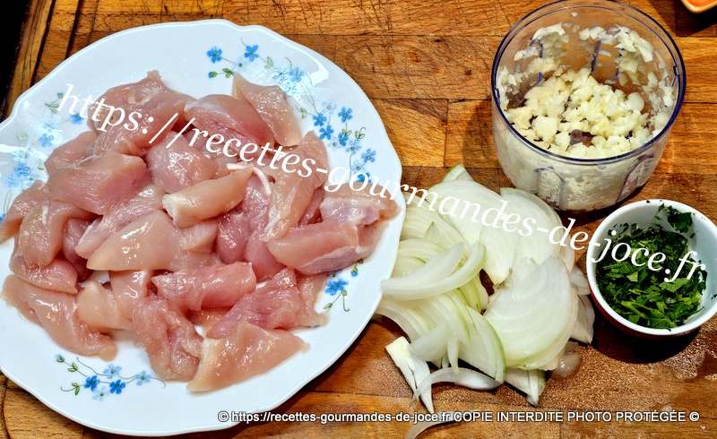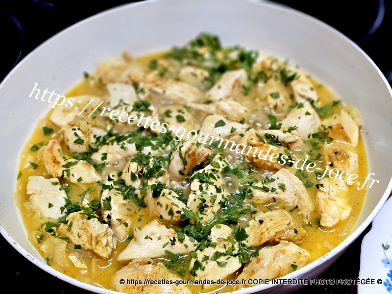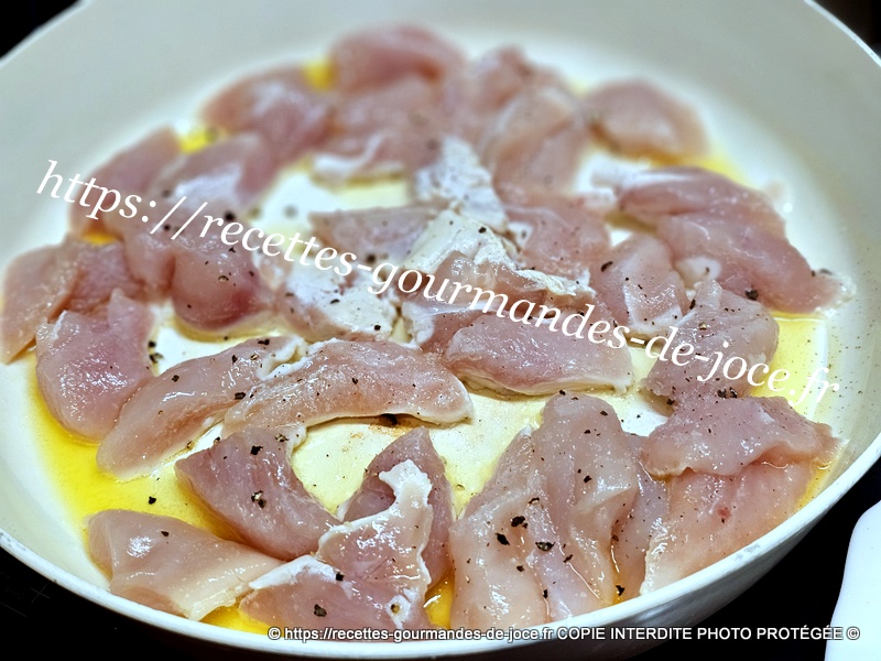 Couper les escalopes en lanières, peler et émincer l’oignon et hacher les gousses d’ail dégermées, laver et ciseler le persil (1 bonne c à s ). Dans une poêle mettre le beurre et l’huile d’olive, lorsque le beurre est fondu ajouter le poulet,