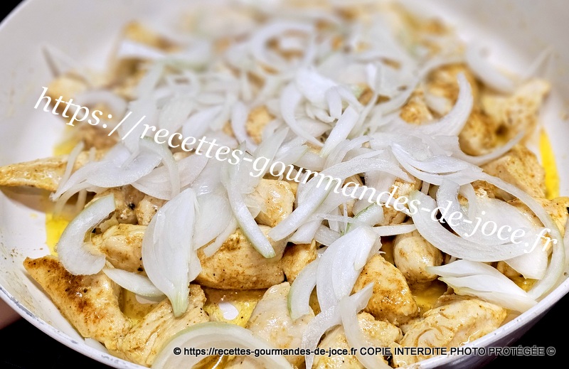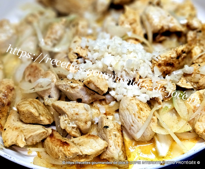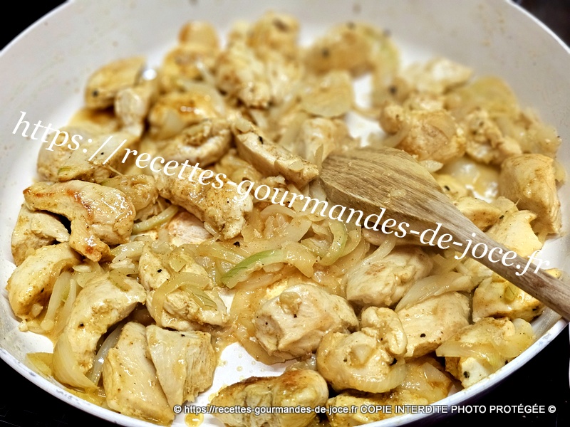 Lorsque le poulet commence à dorer, ajouter les oignons et mélanger. Laisser suer quelques instants puis ajouter l’ail et mélanger à nouveau.