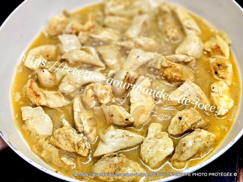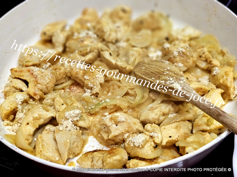 Laisser mijoter 5 minutes en remuant. Ajouter ensuite le fond de volaille et bien remuer, quand ça commence à accrocher légèrement au fond de la poêle,