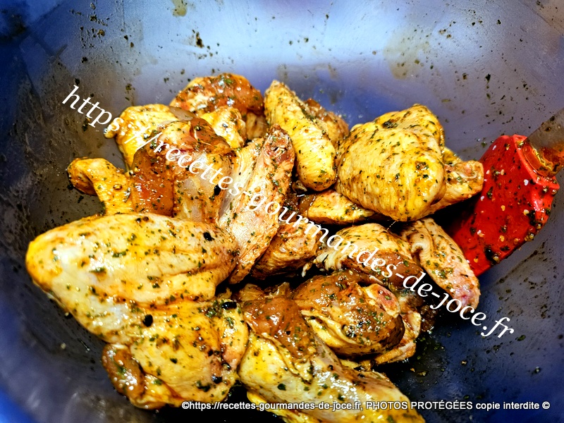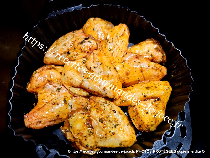 Verser le tout sur les ailes de poulet et mélanger. Déposer les ailes de poulet dans un plat et enfourner à 200° pendant 25 minutes environ selon les fours, retourner les ailes à mi-cuisson et poursuivre la cuisson.